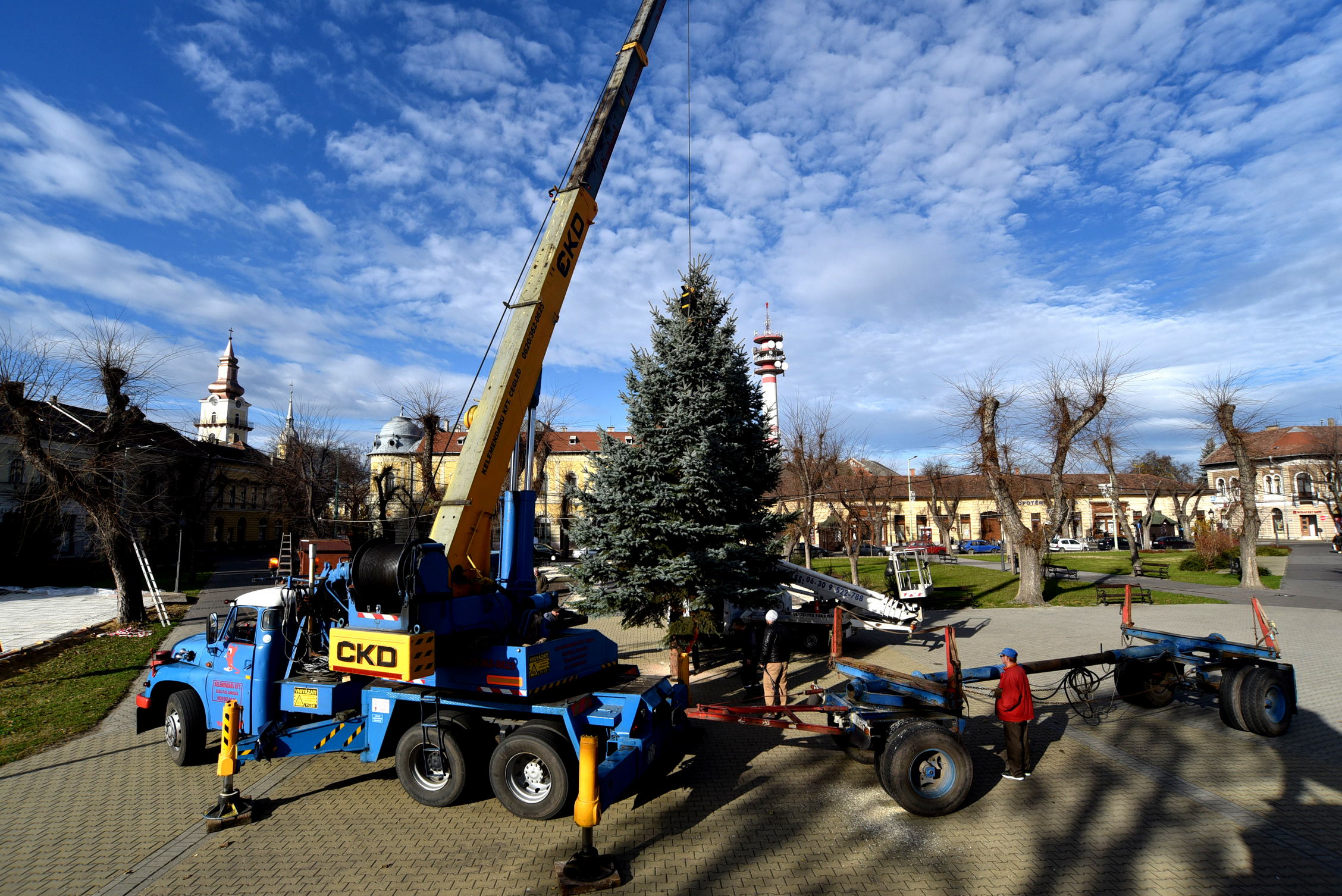A fenyőfa kiemelését és szállítását, valamint a Szabadság téren való felállítását – mint minden évben – Kelemen Zsolt autódarus vállalkozó végezte. A kivágásban kosaras kocsijával Baróti Gábor segített.