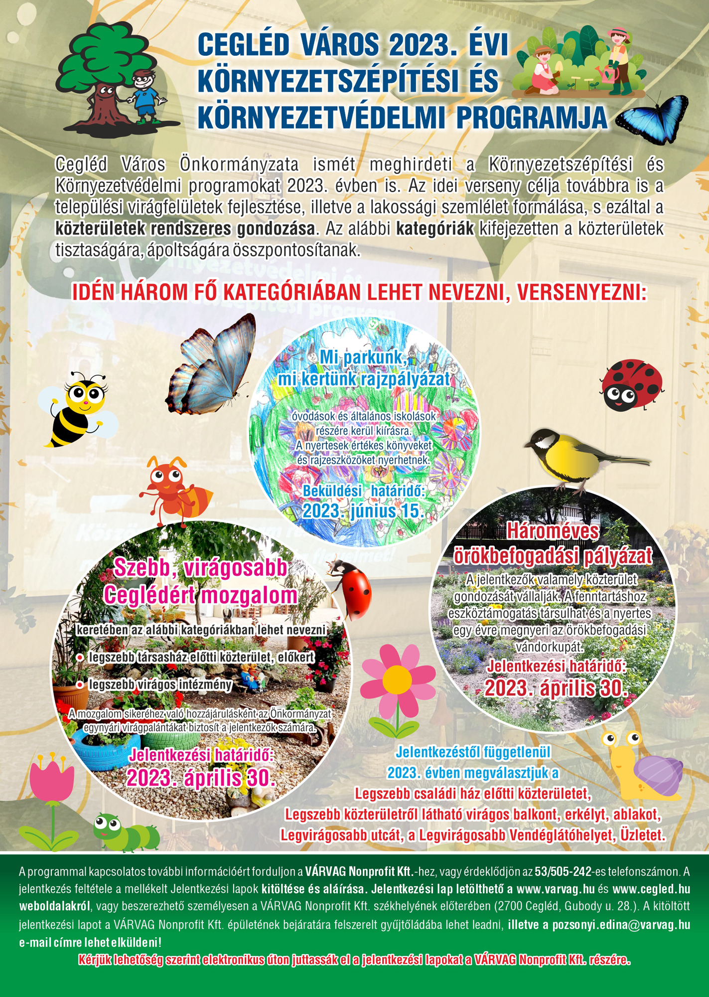 A programmal kapcsolatos további információért forduljon a VÁRVAG Nonprofit Kft.-hez, vagy érdeklődjön az 53/505-242-es telefonszámon. A jelentkezés feltétele a mellékelt Jelentkezési lapok kitöltése és aláírása. Jelentkezési lap letölthető a www.varvag.hu és www.cegled.hu weboldalakról, vagy beszerezhető személyesen a VÁRVAG Nonprofit Kft. székhelyének előterében (2700 Cegléd, Gubody u. 28.). A kitöltött jelentkezési lapot a VÁRVAG Nonprofit Kft. épületének bejáratára felszerelt gyűjtőládába lehet leadni, illetve a pozsonyi.edina@varvag.hu e-mail címre lehet elküldeni!