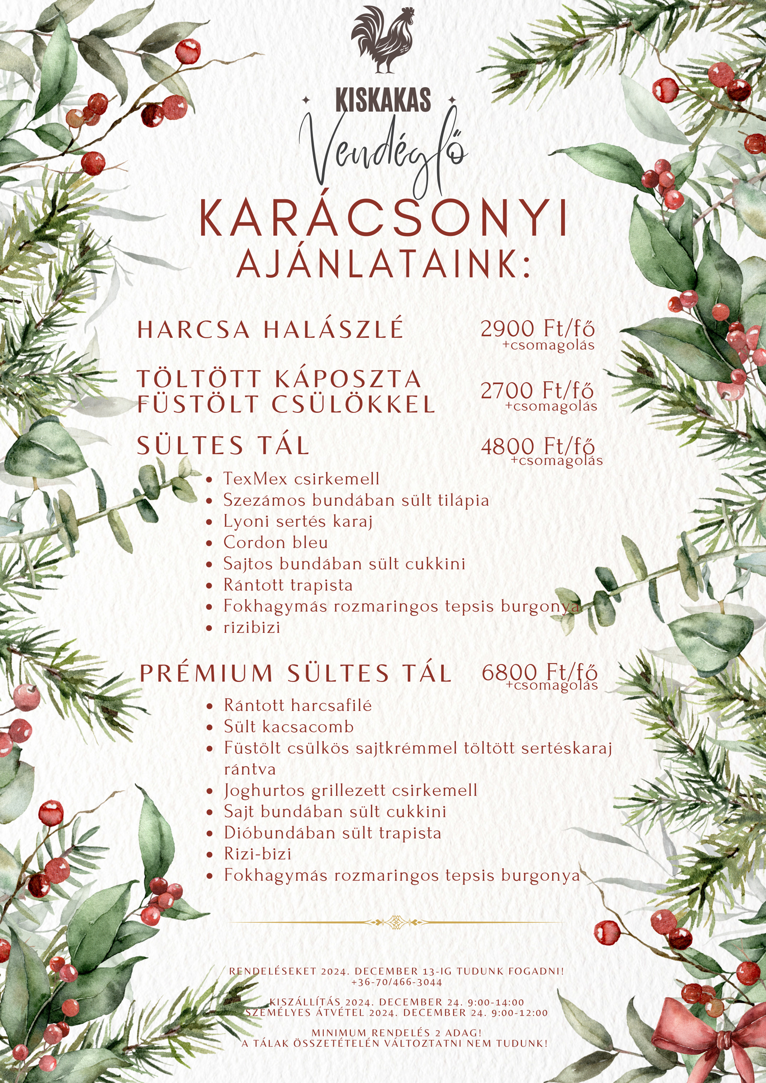 Házhozszállítás hétfőtől péntekig. Megrendeléseket előző napig 14:30-ig tudjuk fogadni az étteremben vagy +36 70 466 3044 telefonszámon. -