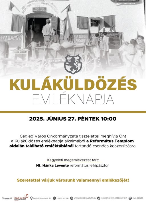 Cegléd Város Önkormányzata tisztelettel meghívja Önt a Kuláküldözés Emléknapja alkalmából a Református Templom oldalán található emléktáblánál tartandó csendes koszorúzásra.