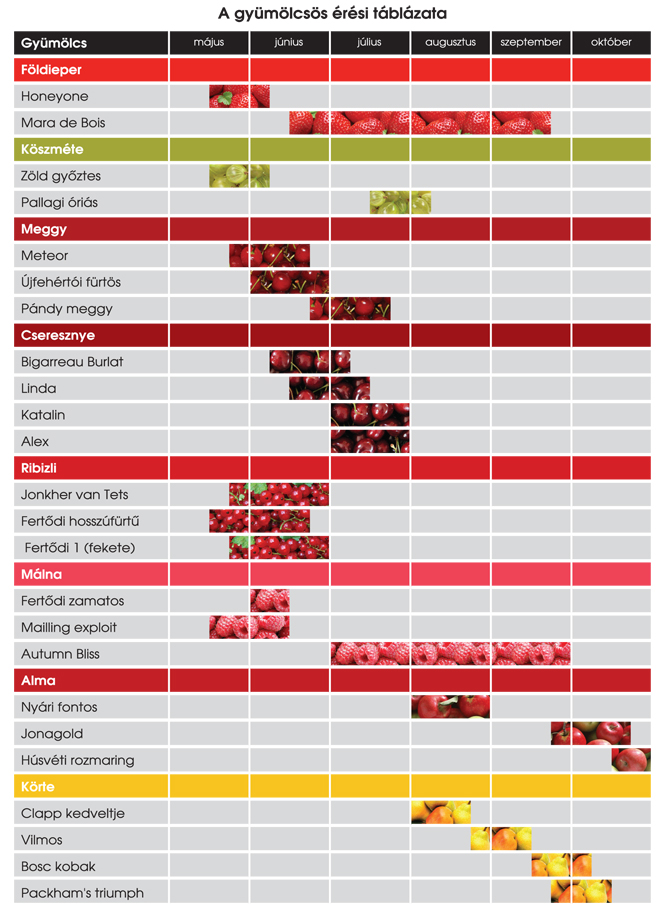 Ahhoz, hogy egész évben friss gyümölcs kerülhessen a családi asztalra, érdemes átgondolni, hogy az adott gyümölcs melyik fajtáját érdemes ültetnünk. Egy ügyesen kialakított gyümölcsös - időjárástól függően - május közepétől akár az első fagyokig teremhet.