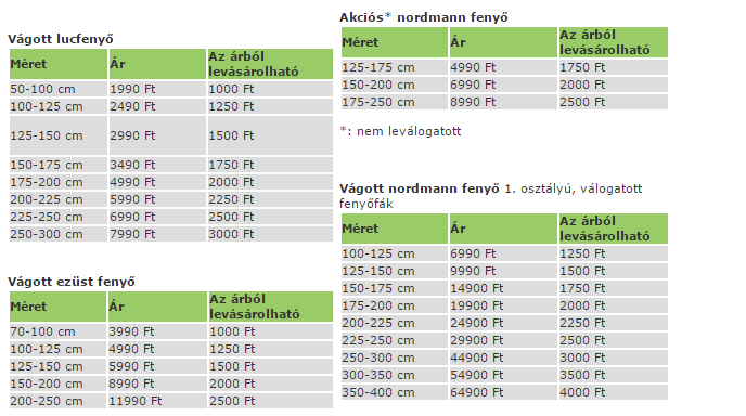 Vásárlónk a meghirdetett vágott fenyő vásárlása esetén - a méretkategória felső határának megfelelően - méterenként 1000 Ft-ról kap vásárlási kupont. A kupon 2016. december 27. és 2017 január 31. között váltható be, legalább 1000 Ft-os - kuponértéken felül fizetett - vásárlás esetén.