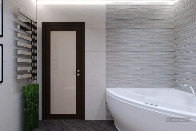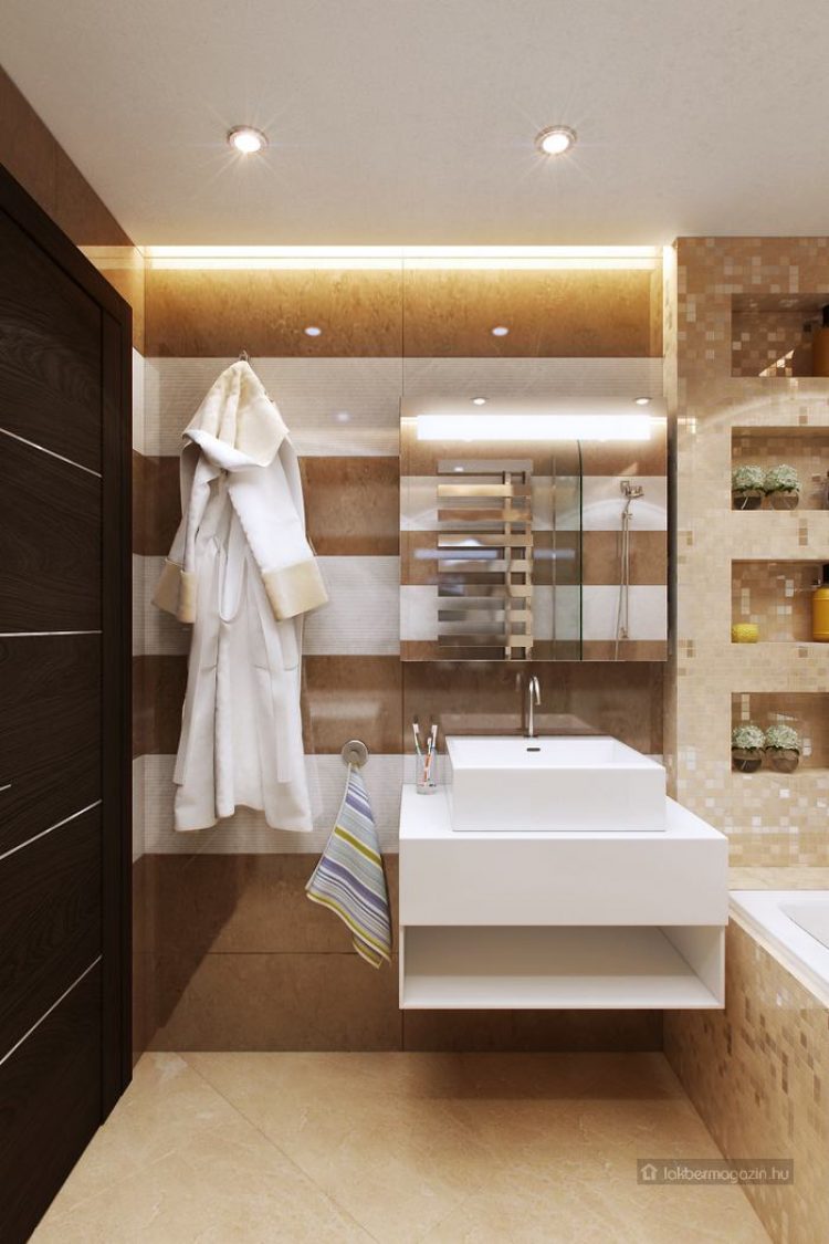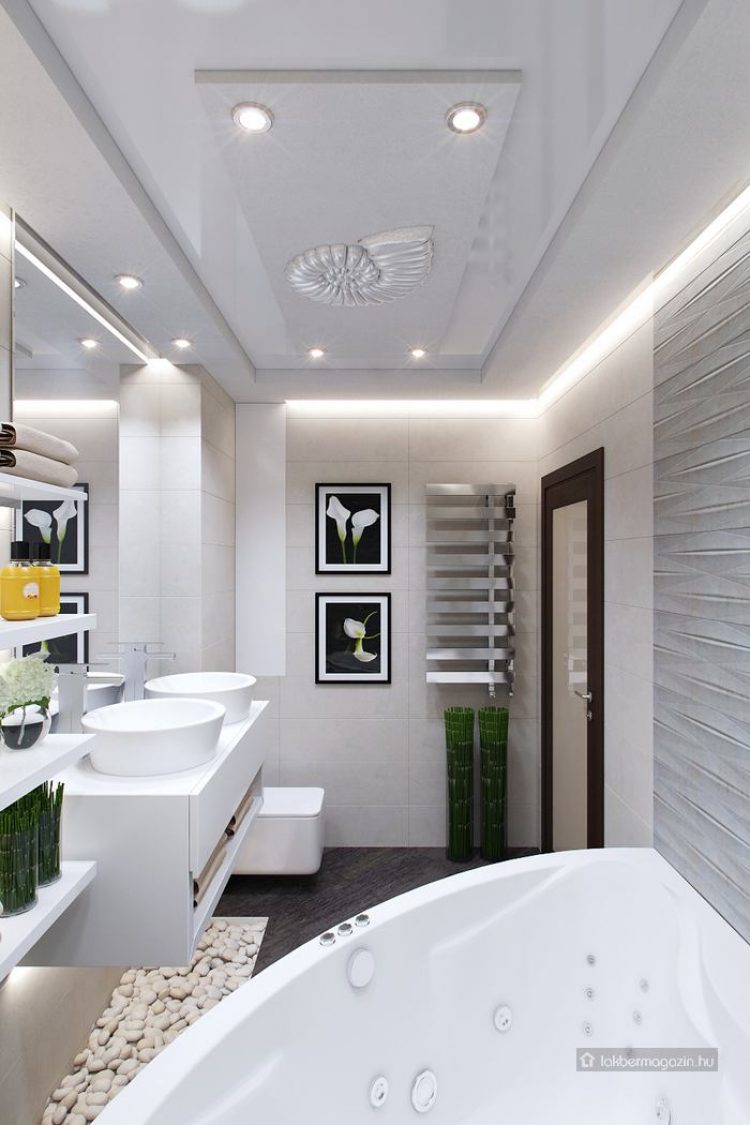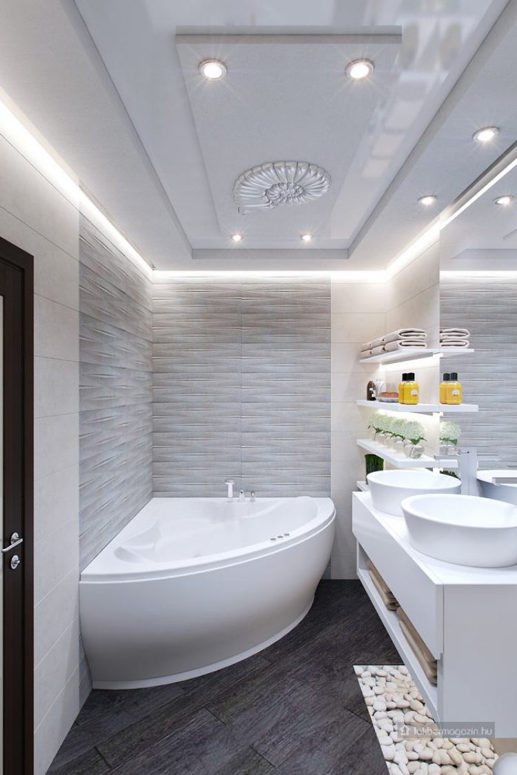 Az első négy kis fürdőszoba Artem Lazarev tervező munkája, kezdésnek mindjárt egy tiszta, világos, spa hangulatot árasztó kis fürdővel - letisztult vonalak, szép burkolatok, ötletes világítás: