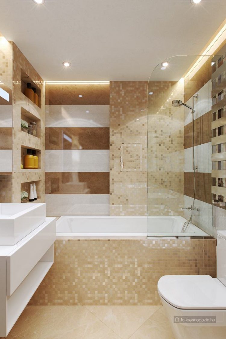 A következő kis fürdőszobában a látványos burkolatoké a főszerep, melegebb színek, gyönyörű mozaik, kontrasztban a fehér elemekkel - nagyon szép a kád melletti falon a beugró polcokkal kialakított praktikus rész: