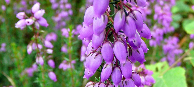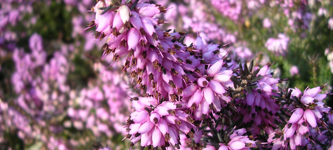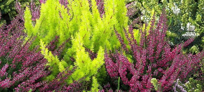 Az Erica Calluna vulgaris (főképen látható) késő nyártól késő őszig virágzik. Levelei színe szezonálisan változik. Inkább a savanyú talajt szereti, és nyáron öntözést kíván, hogy ne szomjazzon.