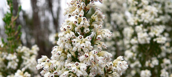 A cserjés hangák (fent), avagy Erica arborea-k a jeges szélre érzékenyek, de ha átvészelik ezt a nehéz időszakot, illatos virágaik tél végétől késő tavaszig virítanak. Nagyon magasra nőnek, így az ágyás hátsó részében is jól mutatnak.