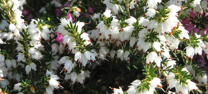 Az Erica darleyensisnek (fent) leginkább fehér és mályvaszínű változatai a legelterjedtebbek. 50 centis középmagas termete mellett legnagyobb erénye, hogy tél közepétől koratavaszig virágzik.