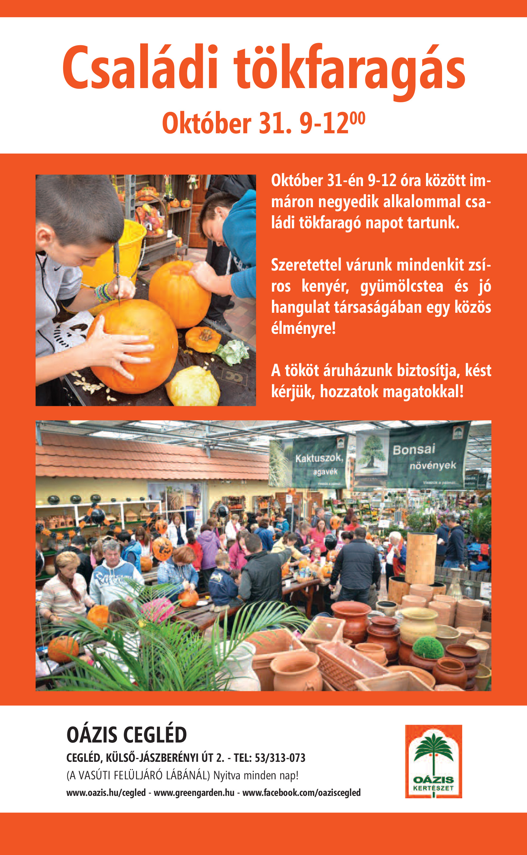 Az Oázis Kertészet október 31-én, szombaton délelőtt 09 és 12 óra között tartja hagyományos tökfaragó családi napját.