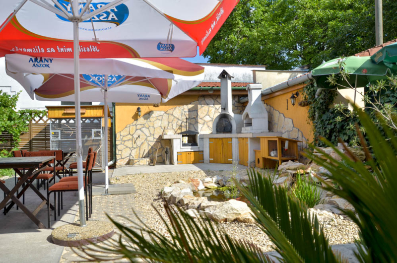 Igényesen kialakított kerthelyiségünk kitűnő helyszín családi, baráti összejövetelekhez,ahol a kerti tó mellett hangulatos körülmények között készíthetőek el bogrács, grill és kemencében sült ételek egyaránt.