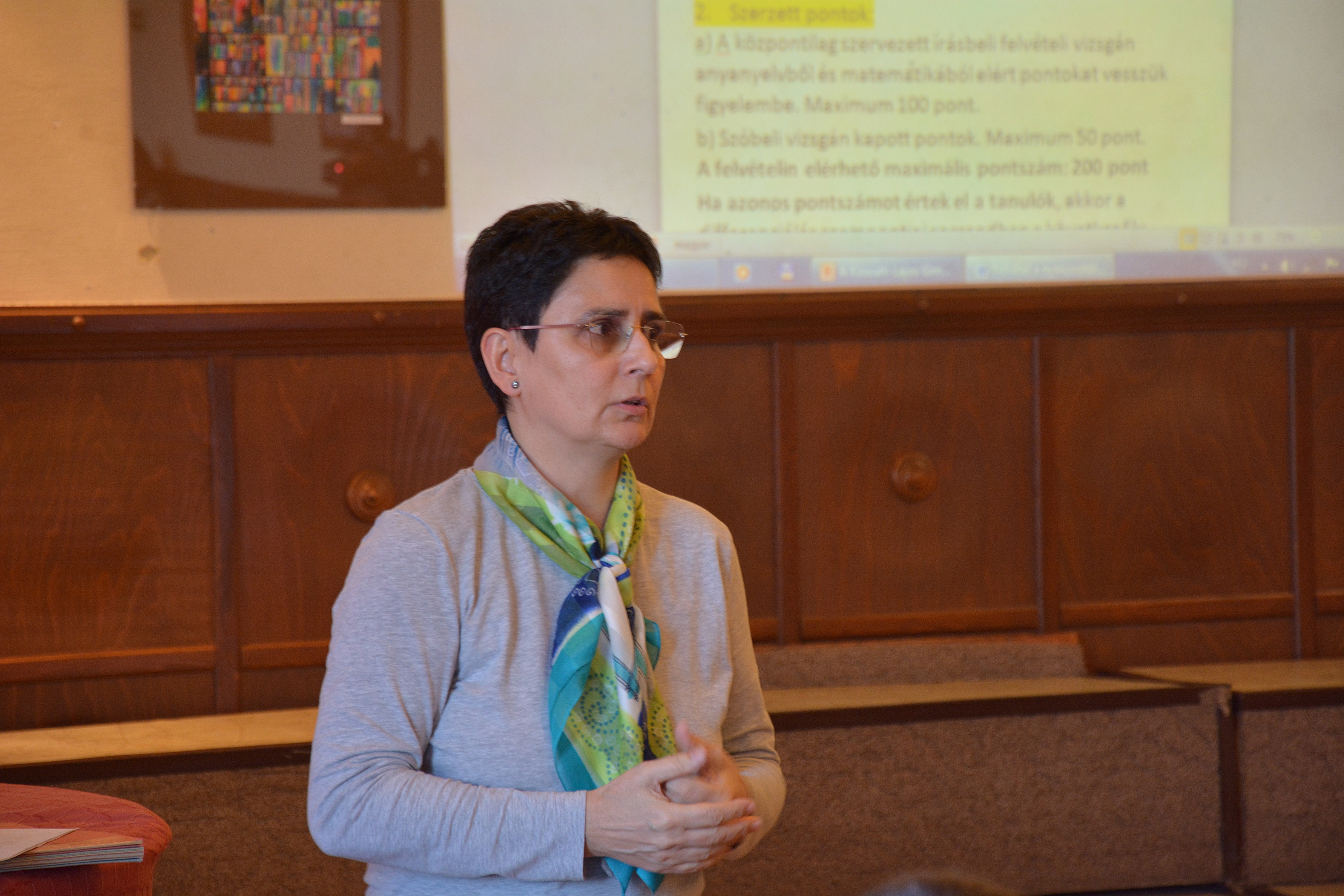 A gimnáziumi diákélet sokszínűségéről Chorendzsák Lili, Fülöp Zsuzsanna, és Tymcsuk Dorina tanulók mesélt a megjelenteknek, akik ezt követően két tanítási órába is bepillantást nyerhettek.