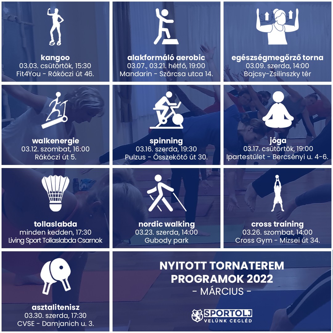 Idén is folytatódnak Cegléd Város Önkormányzatának szervezésében a Nyitott Tornaterem Programok! 10 foglalkozással, köztük új mozgásformával a Kangoo-val várjuk a mozogni vágyókat. A Nyitott Tornaterem Programokon való részvétel továbbra is INGYENES!