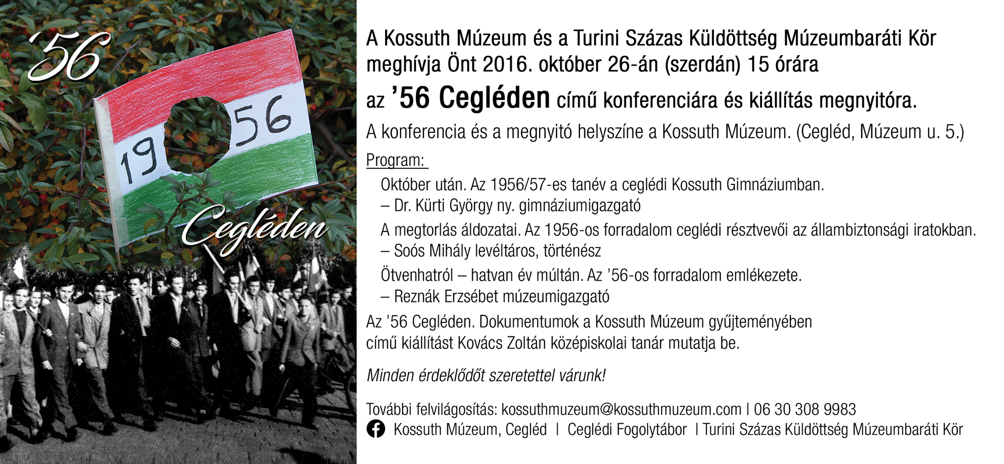 A kiállítás október 26-án délután 3 órakor egy konferencia színtere lesz, ahol az előadók – Kürti György, Soós Mihály, Reznák Erzsébet – az 1956-os forradalmi napok ceglédi eseményeire emlékeznek majd.