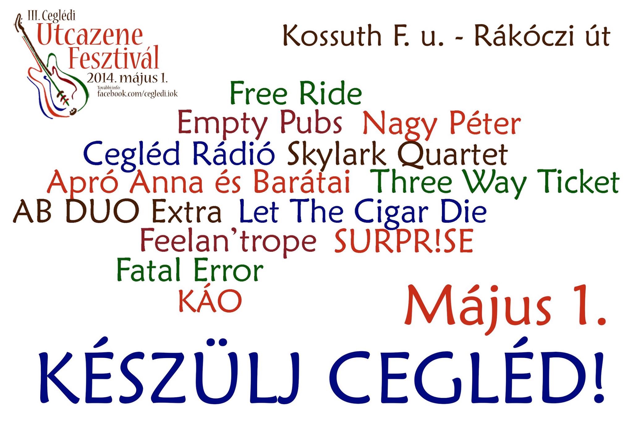 2014. május 1-én kerül megrendezésre a III. Ceglédi Utcazene Fesztivál. Idén lehetőséget kap 2 zenekar arra, hogy kisszínpadra kerüljön. Szavazzatok minél többen, az első két legtöbb szavazatot összegyűjtő csapat lesz a győztes!