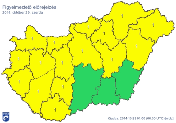 Tartós köd és talajmenti fagy miatt adott ki figyelmeztetést a meteorológiai szolgálat (OMSZ) szerdára szinte az ország teljes területére, kivéve a dél-alföldi megyéket. Csak Csongrádban, Bács-Kiskunban és Békésben nem okoz problémát a köd és a fagy az előrejelzés szerint.