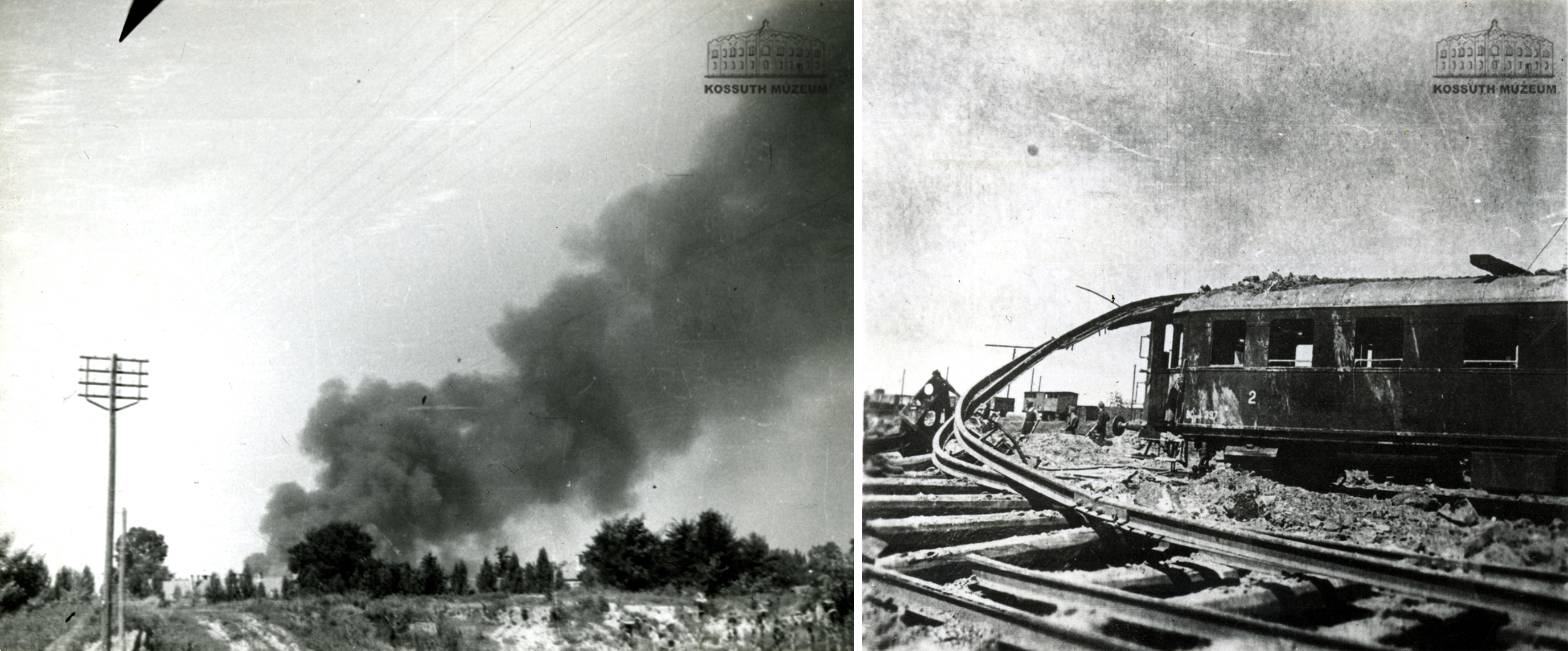 A Kossuth Múzeum gyűjteményében őrzött fotókon az 1944-es ceglédi bombatámadások utáni romok, elpusztult épületek láthatóak.