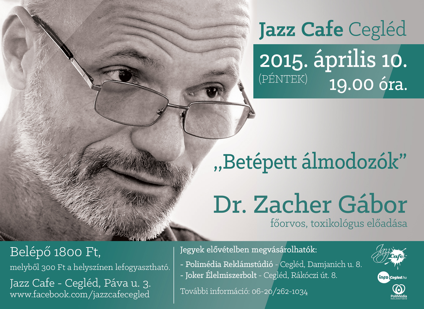 „Betépett Álmodozók” címmel tart előadást Cegléden Dr. Zacher Gábor főorvos, a Péterfy Sándor utcai Kórház klinikai toxikológiai osztályának vezetője. A neves toxikológus a drog- és alkohol fogyasztás árnyoldalát és hatásit mutatja be. Az előadás során egy érdekfeszítő időutazás keretében a különféle tudatmódosító szerek fejlődésével és azon szerhasználókkal ismerkedhetünk meg, akik maradandó alkotásokat hoztak létre.