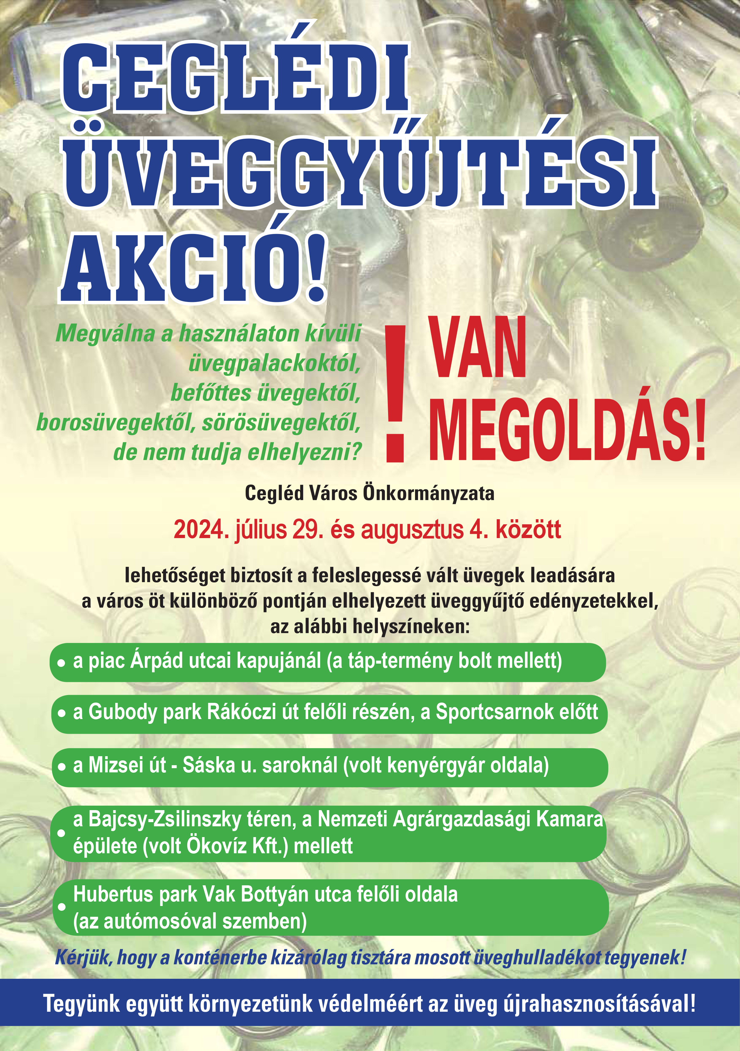 Cegléd Város Önkormányzata 2024. július 29. és augusztus 4. között lehetőséget biztosít a feleslegessé vált üvegek leadására a város öt különböző pontján elhelyezett üveggyűjtő edényzetekkel, az alábbi helyszíneken.