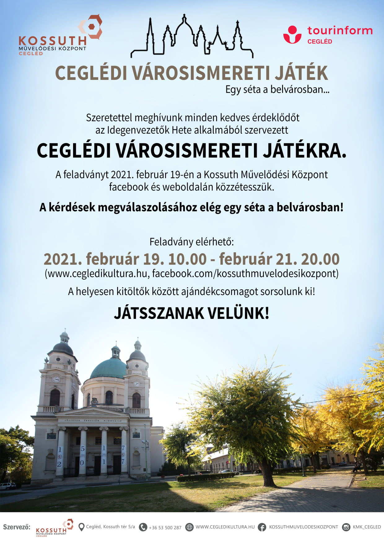 A kvízjáték a Tourinform irodában nyomtatott formában is beszerezhető, vagy a Kossuth Művelődési Központ és a Ceglédi Tourinform facebook oldalán és weboldalunkon (cegledikultura.hu) is elérhető.