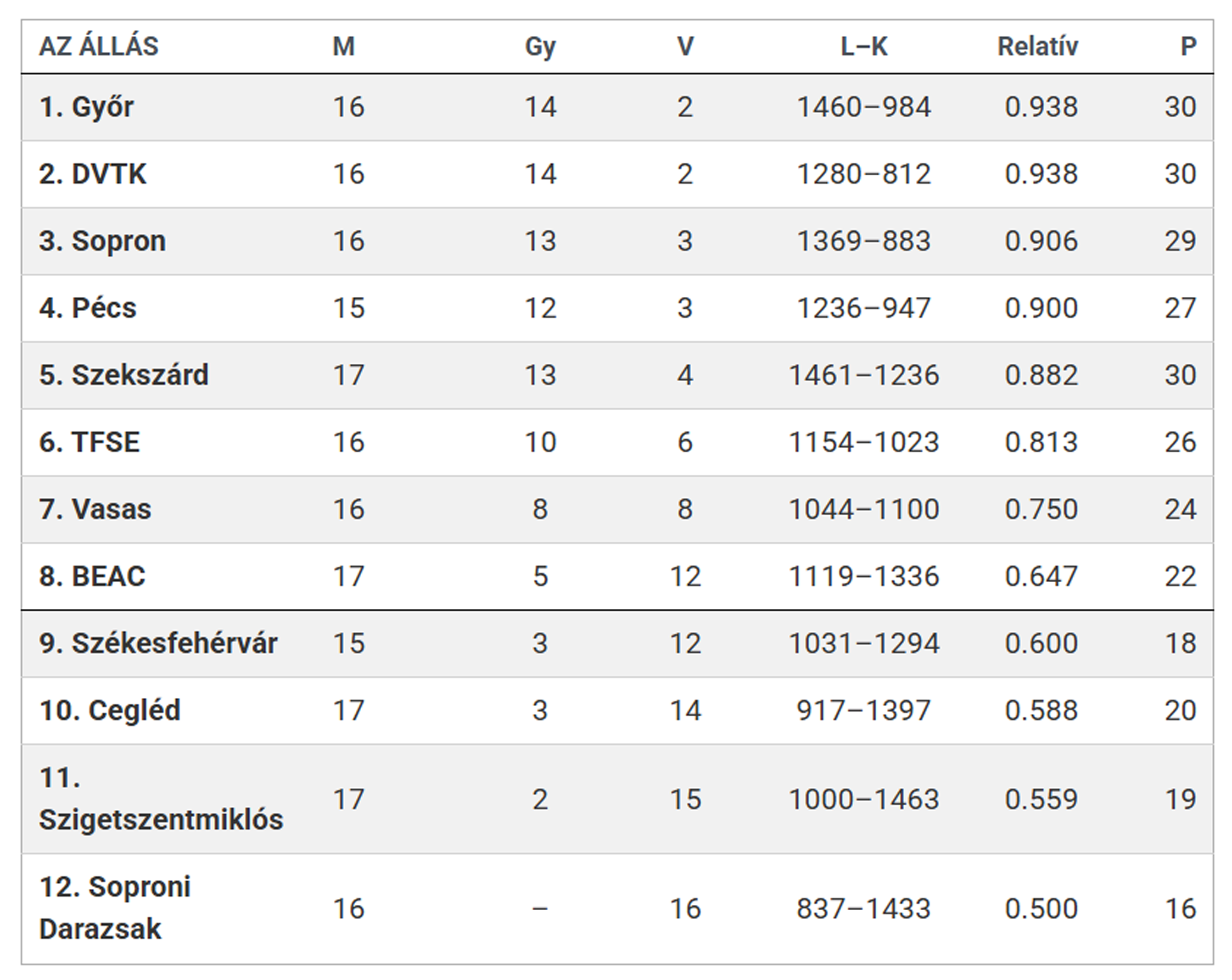 GYŐR: DOMBAI 20/9, Mészáros Á. 3/3, Garbin 8/6, TELENGA 12, KISS V. 17. Csere: Angyal, Dubei 6, Ács 3/3, Wentzel 14/6, Goree 4, Ruff-Nagy 13. Edző: Cziczás László