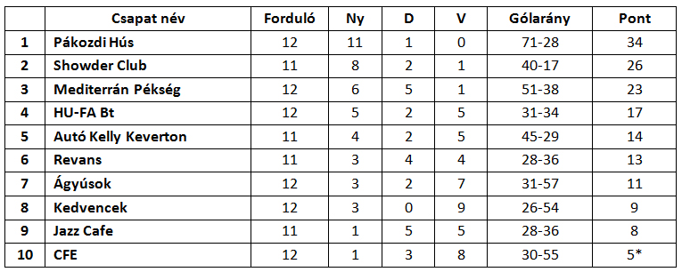 Pákozdi Hús – Ágyúsok 9-2 • Revans – CFE 5-4 • Kedvencek – HU-FA Bt 4-5