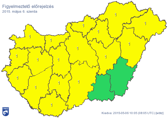 Korábban még csak Pest, Borsod-Abaúj-Zemplén, Hajdú-Bihar, Heves, Nógrád, Szabolcs-Szatmár-Bereg és Jász-Nagykun-Szolnok megyére adtak ki elsőfokú citromsárga figyelmeztetést, de már tizenhét megyére kiterjesztették azt. Egyedül Csongrád és Békés megyében nem várható veszélyes időjárási jelenség - derül ki az Országos Meteorológiai Szolgálat honlapjáról.