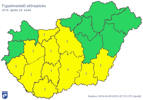 Az Országos Meteorológiai Szolgálat hétfői veszélyjelzése szerint Baranya, Bács-Kiskun, Békés, Csongrád, Fejér, Komárom-Esztergom, Somogy, Tolna, Veszprém, Zala és Pest megyére, valamint Budapestre adtak ki citromsárga, vagyis elsőfokú figyelmeztetést, mivel ezeken a területeken az intenzív záporokból, zivatarokból rövid idő alatt 25-30 milliméternél is több csapadék hullhat.