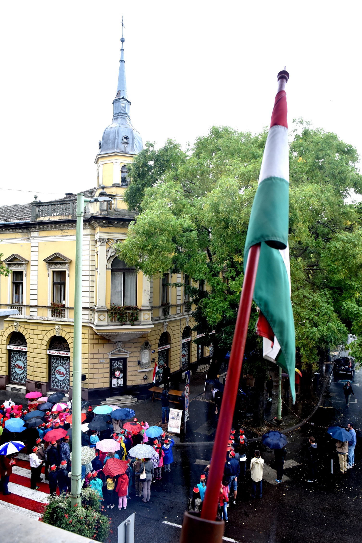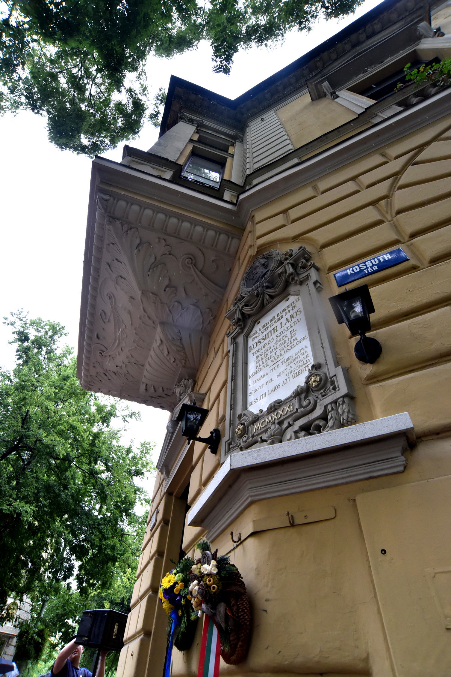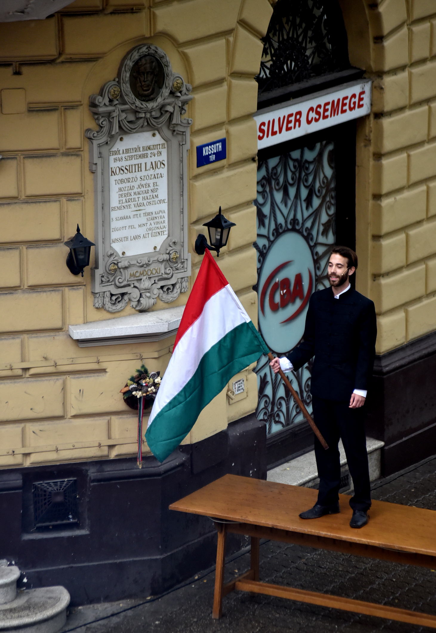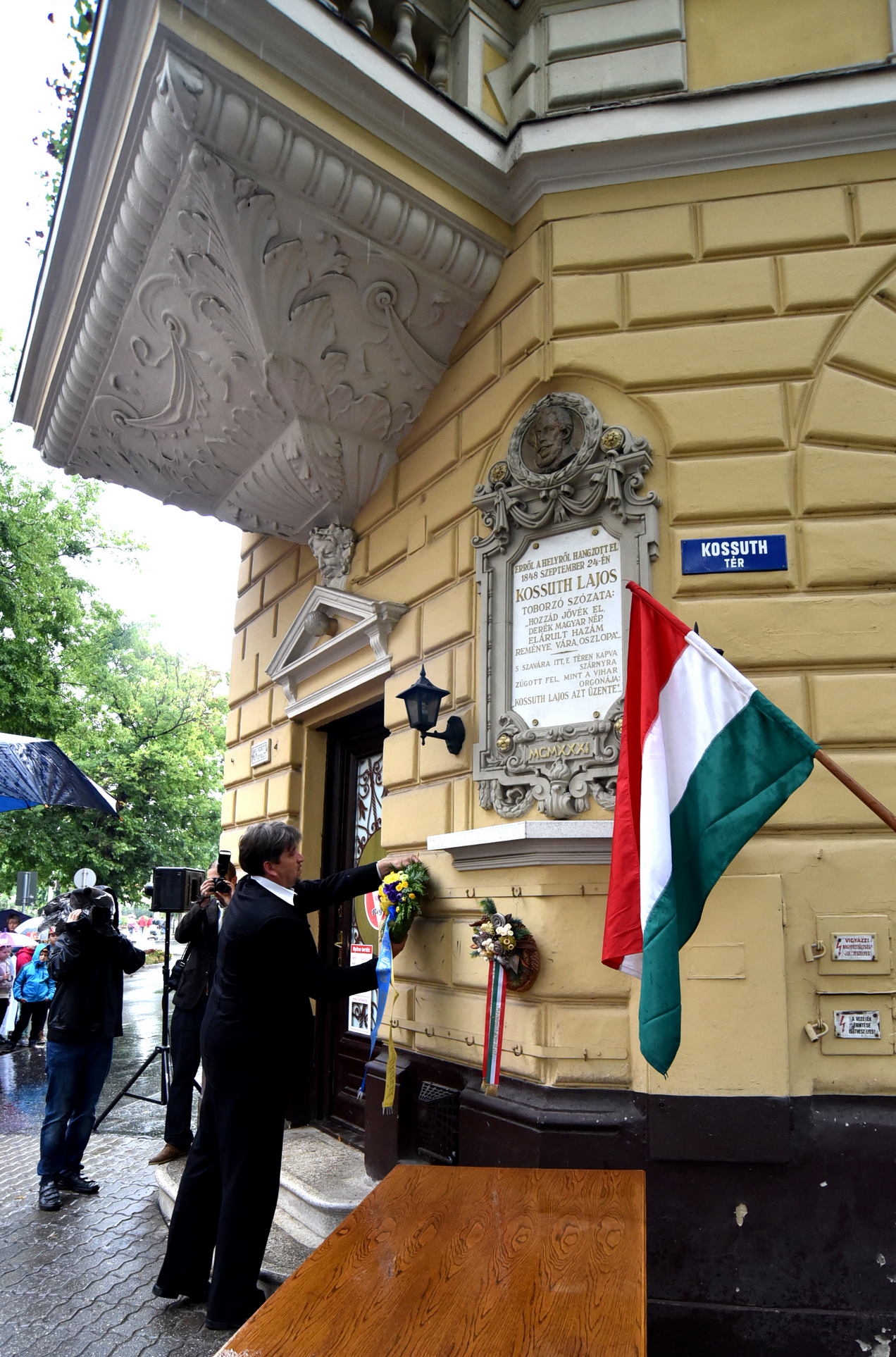 A beszéd elhangzását követően a város képviseletében Takáts László polgármester, valamint Hegedűs Ágota alpolgármester megkoszorúzták a Kossuth táblát.