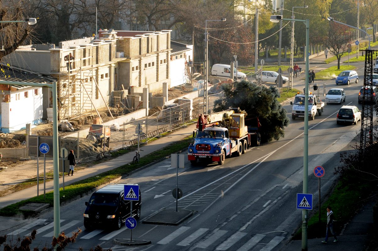 A város idei karácsonyfáját a szerda reggel még a Tüske utcában érte, néhány órával később azonban már a városközpontjában magasodott.