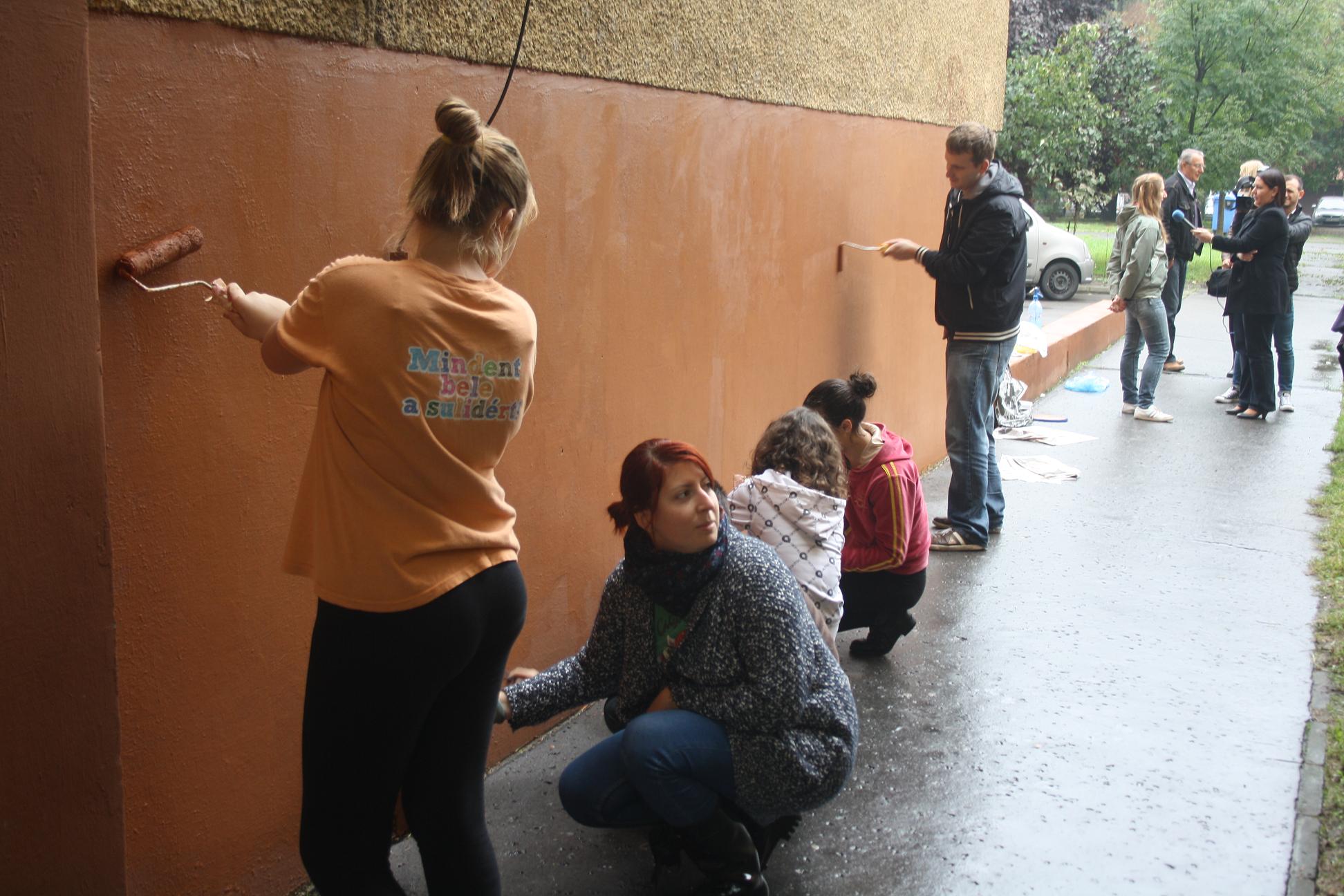 Természetesen fontos volt, hogy legyen olyan festék, ami passzol a házhoz. A Városvédő és Szépítő Egyesület elnöke, Kocsis István kereste fel a ház közös képviselőjét azzal, hogy a fiatalok hoznák munkáskezeiket és lelkesedésüket. Fogjanak össze, hogy újra szép lehessen a ház. „Örültem neki, mert ugye nemrégen festettünk. Tavaly nyáron volt festve és nemrégiben összepingálták itt az egészet. És ez bántott. Elől és itt oldalt volt falfirka, így megoldható volt, hogy ne kelljen az egészet végigfesteni. Az volt a szerencsénk, hogy ezt a festéket újra ki tudták keverni. Aki volt festőnk, őt kértem meg, biztosította a festéket, mi kifizettük és vártunk a Kocsis úr vezetésével a munkára. És nagyon örülünk neki.” – tette hozzá a közös képviselő, Kovács Istvánné.