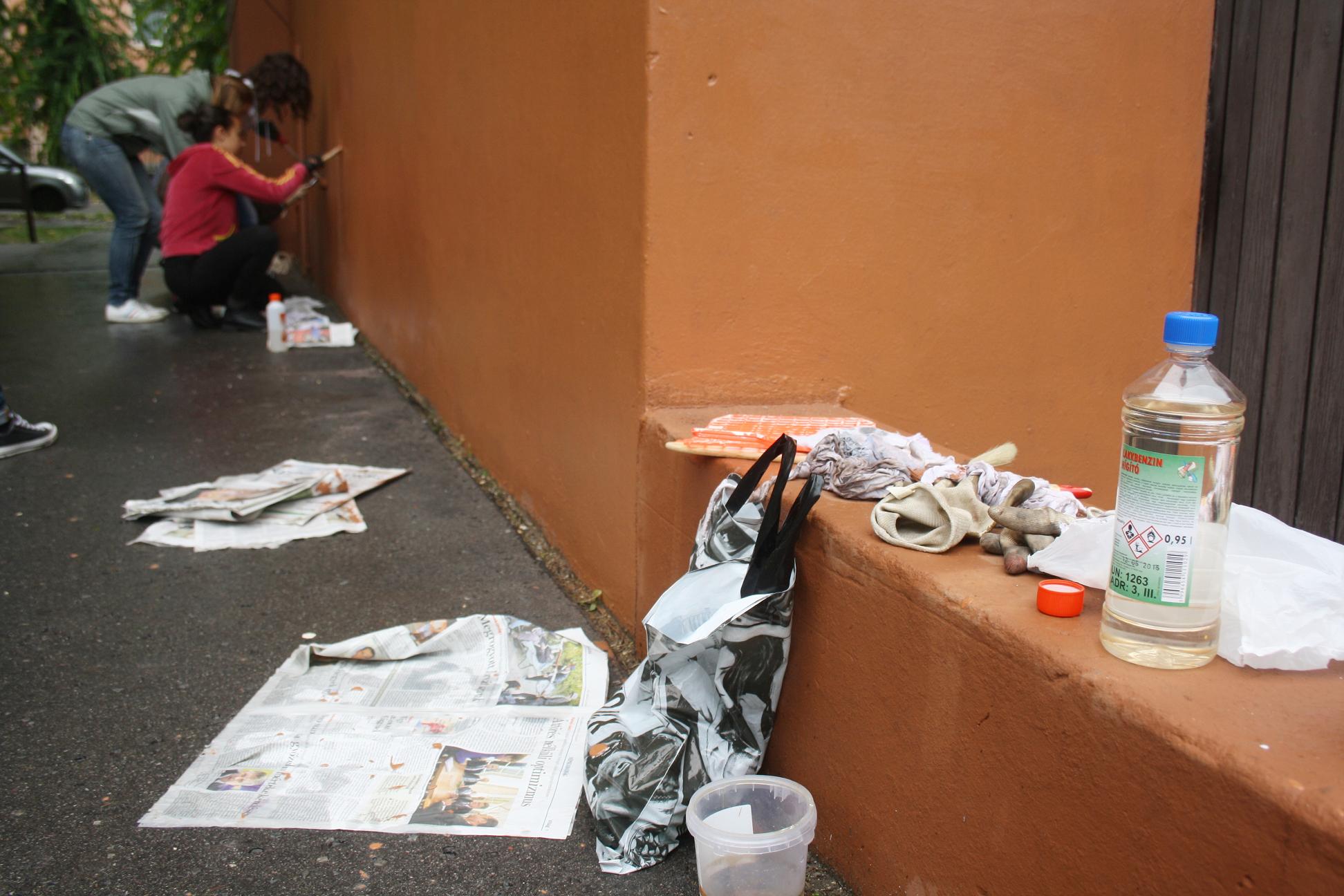 Az épületet tavaly festették le, nemrég azonban valaki vagy valakik falfirkákkal csúfították el a falat. Most ezeket a graffitiket tűntették el a városvédő és szépítő fiatalok.