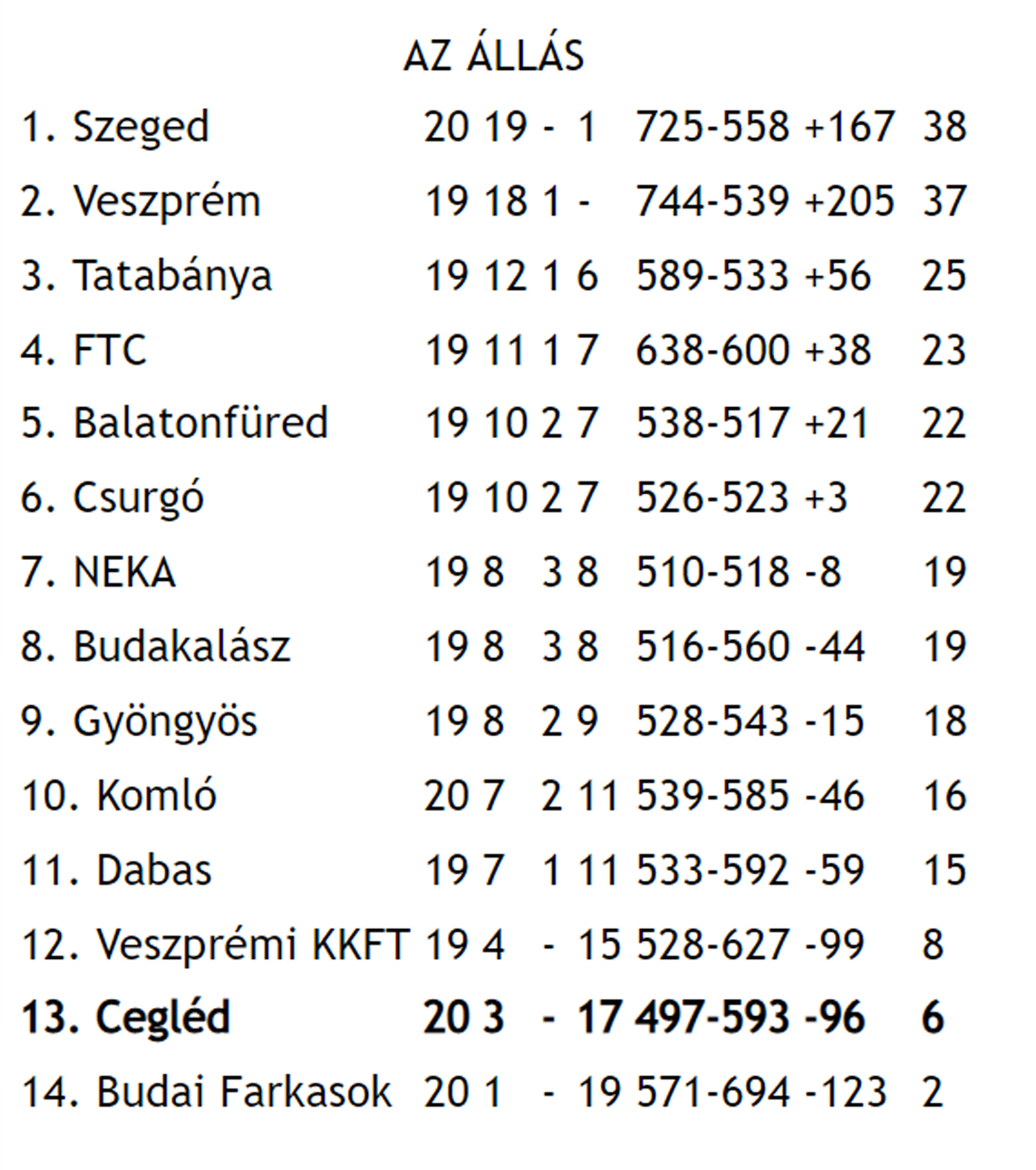 CEGLÉD: Kránitz - PÁSZTOR 6 (5), Kállai 2, SPEKHARDT 4, Bartha, Juhász 1, Szepesi 1. Csere: DZSAMALI 9, Teleki, Tóth 1, Császár 1, Markovics 1, Mazák, Csomor. Edző: Nagy Károly