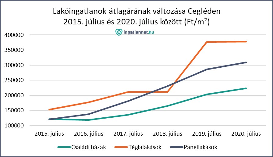 2015. július és 2020. július között valamennyi ceglédi ingatlantípus meredeken felfelé ívelő pályát futott be – bár az elmúlt egy évben már mérsékeltebb volt az áremelkedés, sőt a téglalakások esetében stagnálásról beszélhetünk.