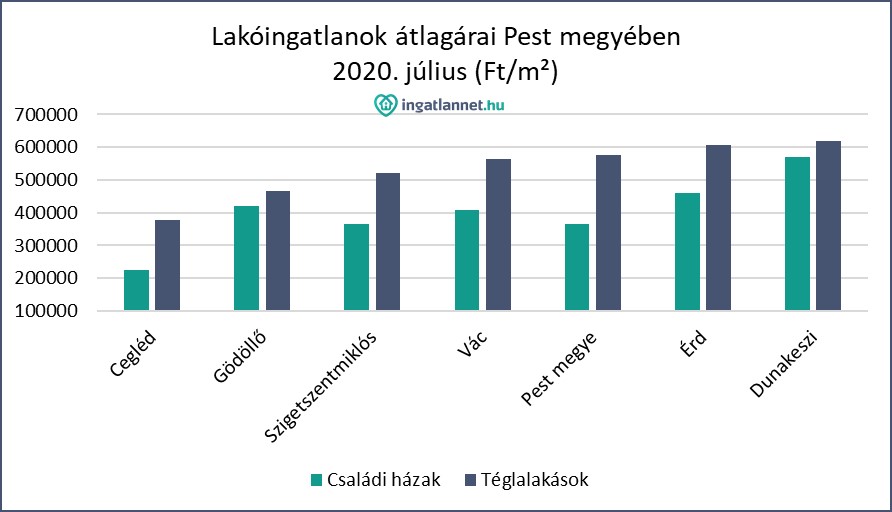 Pest megye általunk vizsgált településeinek az ingatlanpiaca kivétel nélkül drágábbnak bizonyult Ceglédnél. A ceglédi házak júliusi 220 ezer Ft/m² átlagáránál Szigetszentmiklóson 150 ezer forinttal, Gödöllőn és Vácon csaknem 200 ezer forinttal, míg Érden 240 ezer forinttal, Dunakeszin pedig 350 ezer forinttal voltak magasabbak a házak árai négyzetméterenként.