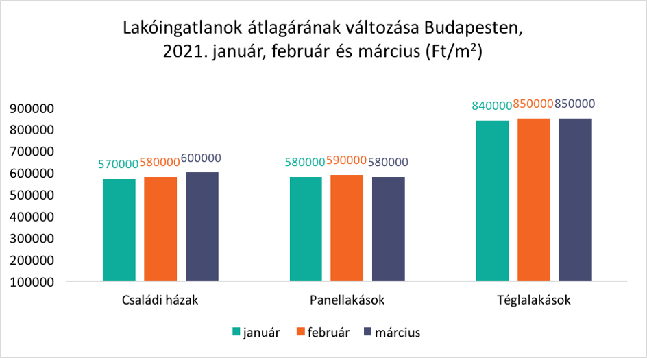 Mindezek után már nem meglepő, hogy a fővárosban a családi házak átlagárának változása sem volt látványos, bár a lakásokhoz képest többet mozgolódtak. A családi házak négyzetméter ára idén 570 ezer Ft/m2-ről kezdődött, mely februárra 10 ezer Ft/m2-rel, márciusra pedig még 20 ezer Ft/m2-rel lett magasabb.