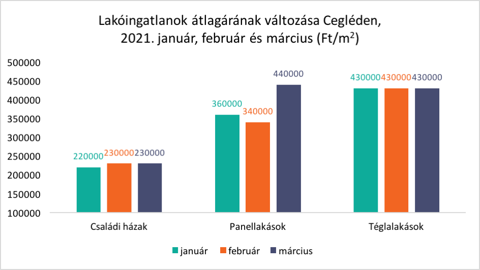 Cegléd lakóingatlan-típusai közül a családi házak és a téglalakások átlagos négyzetméter ára 2021 első három hónapjában szinte teljesen megegyezett, csak nüansznyi különbség fedezhető fel. A házak átlagára januárban 220 ezer Ft/m2 volt, februárban és márciusban pedig egyaránt 230 ezer Ft/m2. A téglalakások ára Cegléden viszont még ennyit sem mozgolódott egyik irányban sem, idén eddig végig átlag 450 ezer Ft/m2 áron kínálták őket eladásra a tulajdonosok.