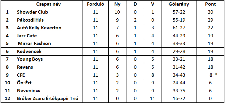 Ismét egy maratoni dupla fordulón vagyunk túl. Tovább tart a versenyfutás az első helyért a Showder Club és a Pákozdi Hús csapata között. Kezd magára találni a Jazz Cafe és stabilizálja magát a felső régióban az Autó Kelly Keverton. A góllövőlistát továbbra is Oldal Tibor vezeti, aki már 25 találatot jegyezhet magának. Néhány mondat az egyes csapatok szerepléséről.