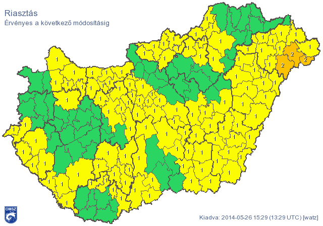 Figyelmeztető előrejelzés Magyarország területére 2014.05.27. kedd éjfélig