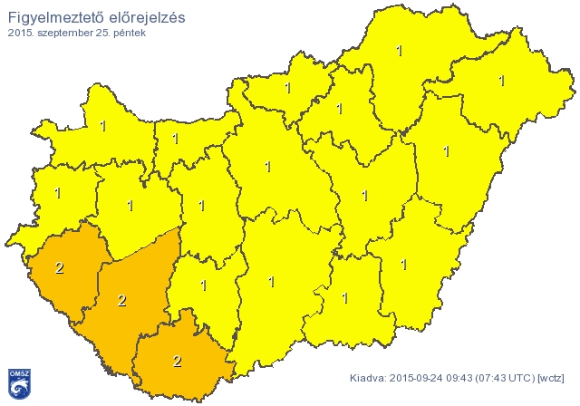 Pénteken Bács-Kiskun, Csongrád, Békés, Zala és Vas megye kivételével az egész országban elsőfokú figyelmeztetést rendelt el az Országos Meteorológiai Szolgálat. Nagyrészt erősen felhős vagy borult lesz az ég, csak kisebb körzetekben – elsősorban keleten – lehet átmeneti felszakadozás. Sokfelé várható eső, zápor, zivatar. Többfelé jelentős mennyiségű csapadékra van kilátás. A északias szelet a Dunántúlon erős, a Nyugat-Dunántúlon helyenként viharos lökések kísérik, de zivatarban másutt is lehet erős vagy zivatar széllökés. A legalacsonyabb éjszakai hőmérséklet 11 és 17, a legmagasabb nappali hőmérséklet általában 15 és 22 fok között alakul, de a Tiszántúlon 23, 24 fok is lehet.