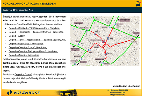 A Volánbusz Zrt. tájékoztatja tisztelt utasait, hogy Cegléden, 2015. november 7-én 12:00 és 17:00 között - a Kossuth Ferenc utca és a Pesti út kereszteződésében lévők körforgalom festése miatt a