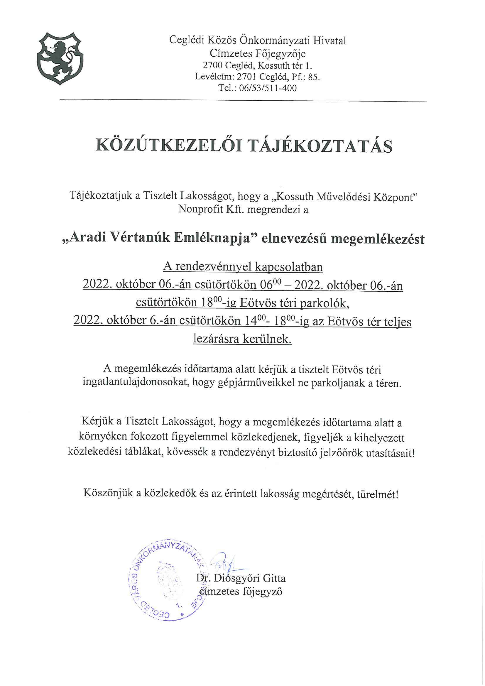 Kérjük a Tisztelt Lakosságot, hogy a megemlékezés időtartama alatt a környéken fokozott figyelemmel közlekedjenek, figyeljék a kihelyezett közlekedési táblákat, kövessék a rendezvényt biztosító jelzőőrök utasításait!