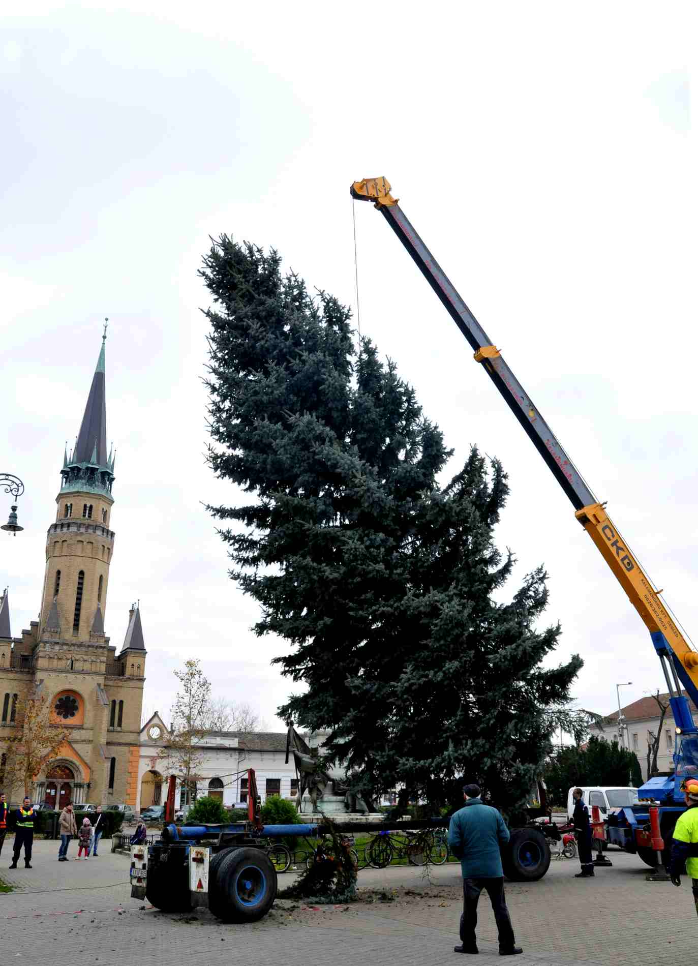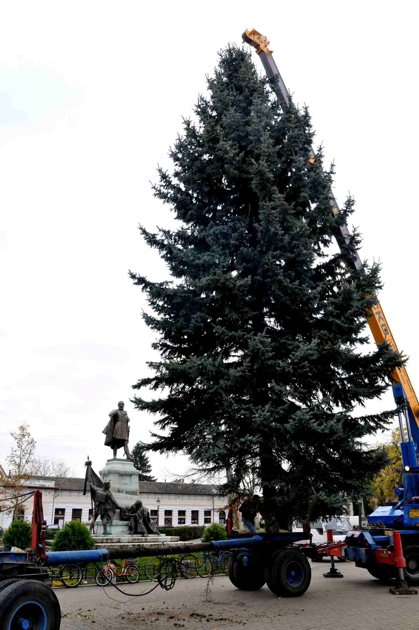 A város idei karácsonyfáját a péntek reggel még a Külső-Budai úti Zrínyi utcában érte, néhány órával később azonban már a városközpontjában magasodott.