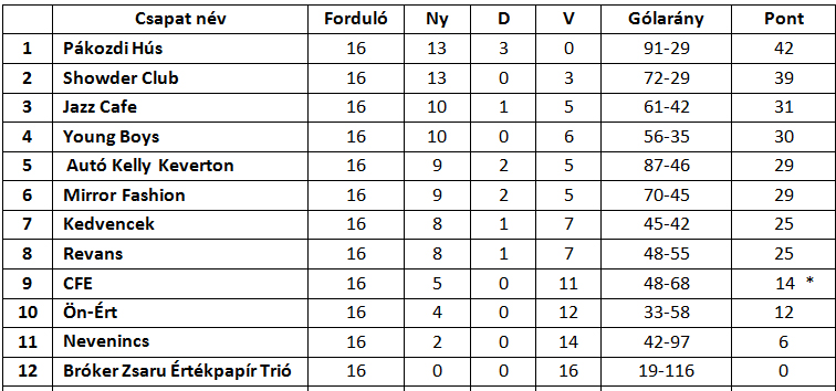Pákozdi Hús Kupa eredményei a 16. forduló után.