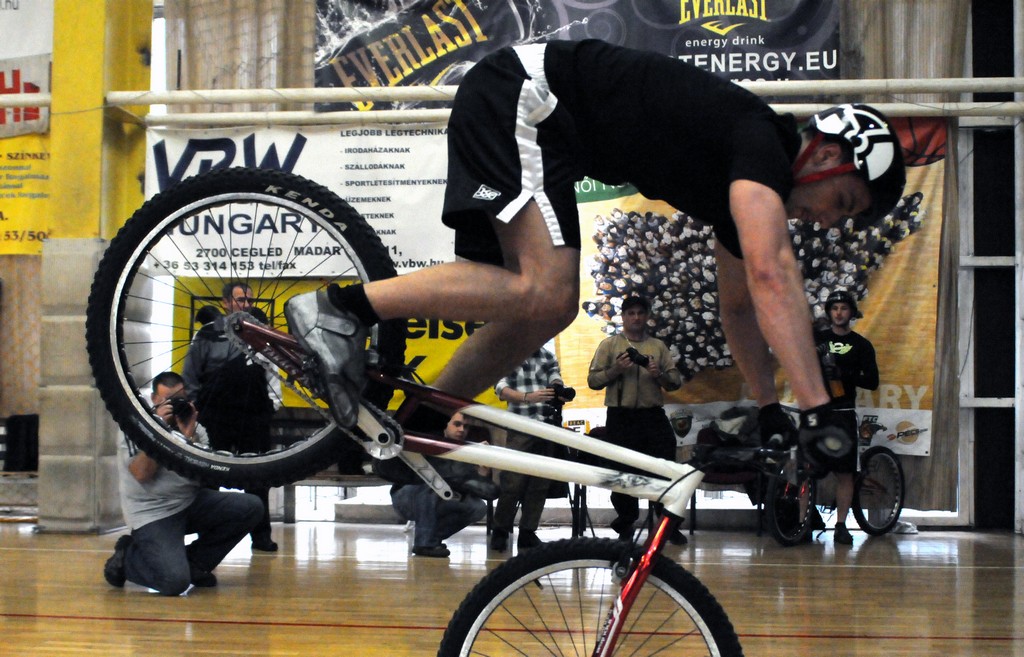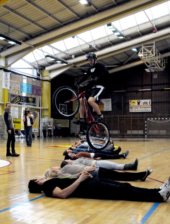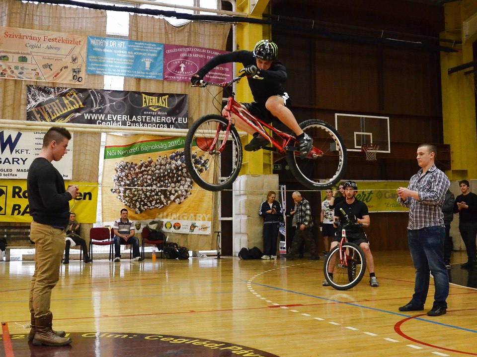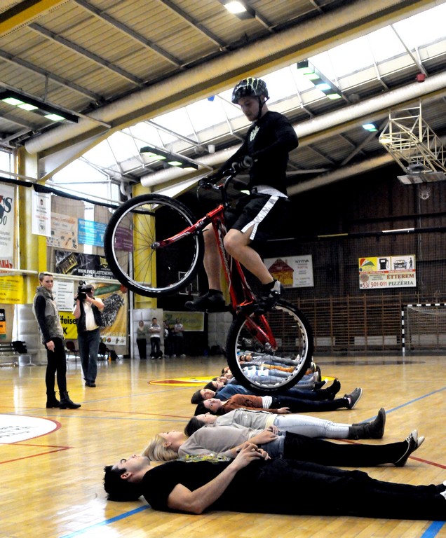 Az elgondolást tett követte, és pénteken a Cegléd Városi Sportcsarnokban rengeteg szurkoló előtt előbb egymástól fél méterre fekvő 32 embert ugrott át egymás után kerékpárja hátsó kerekén pattogva – ez nem hivatalos világrekord –, majd az oldalugrás 117 centiméteres magyar rekordját szárnyalta túl egy 130 centis ugrással, ám sajnos utóbbi sem fogadható el egyelőre hivatalos rekordnak.