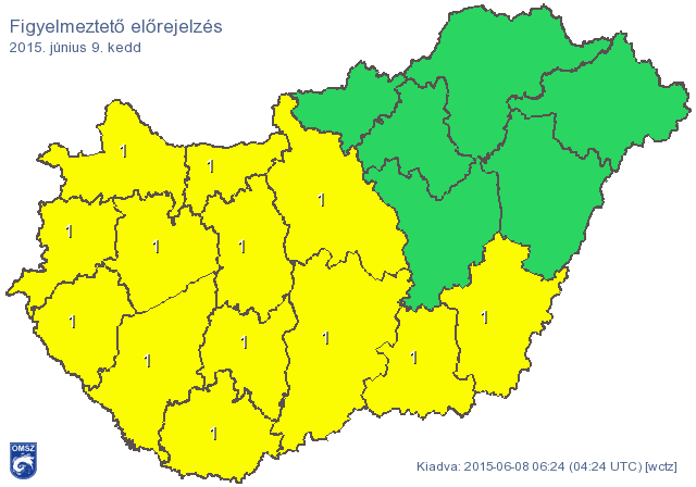Az Országos Meteoológiai Szolgálat az ország nyugati és középső harmadára citromsárga figyelmeztető előrejelzést adott ki a várható zivatarok miatt.