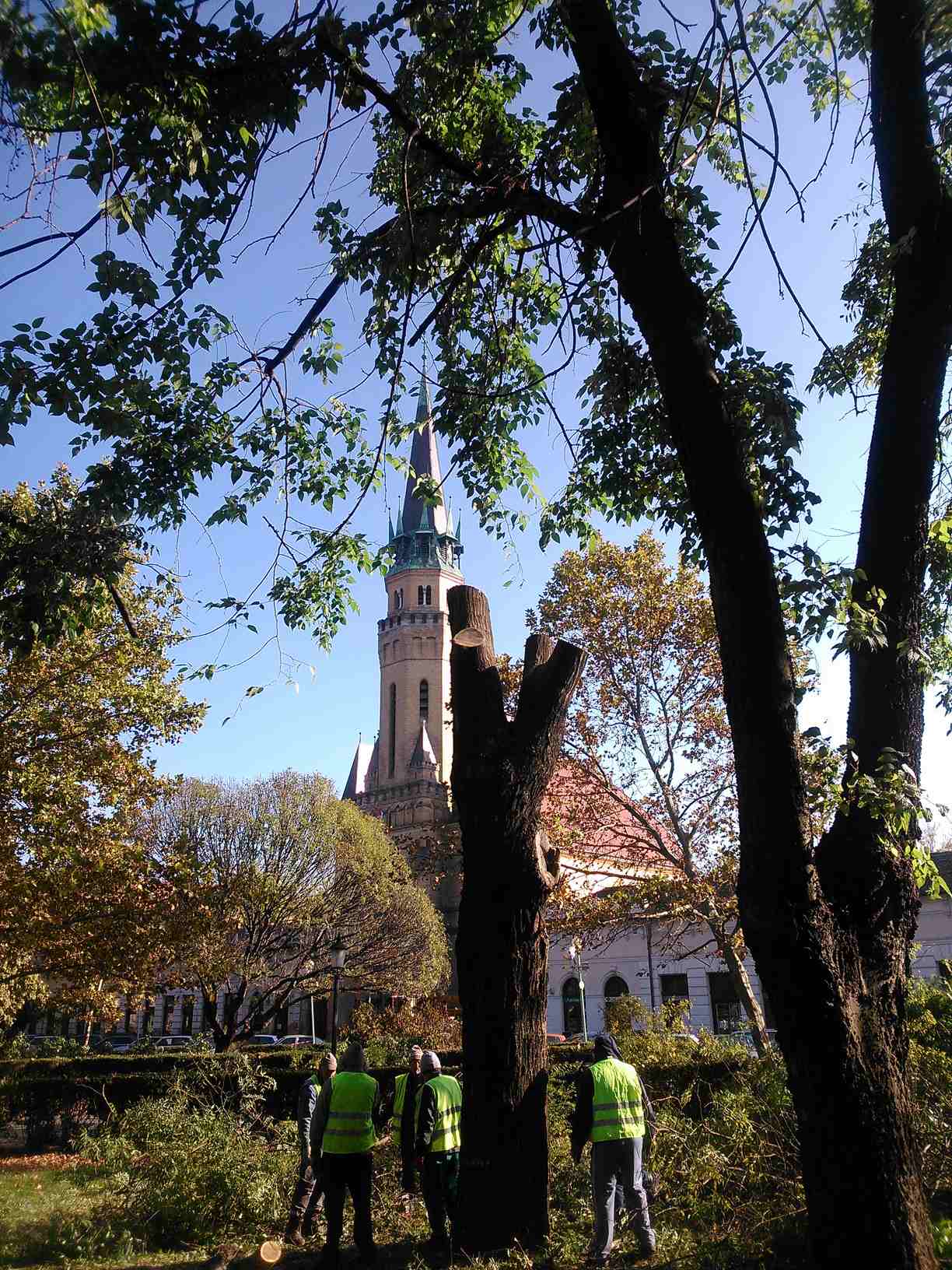 A mai napon elkezdődött a téren található fák kivágása illetve ifjítása.