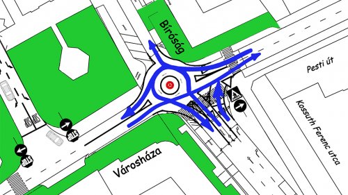 A Kossuth Ferenc utca városháza előtti részén megmarad a két forgalmi sáv, azaz a belső sávból az autók a körforgalom segítségével balra kanyarodhatnak, illetve egyenesen haladhatnak tovább a piac felé, a külsőből pedig jobbra mehetnek tovább a Pesti út irányába. A Pesti út Városház előtti részén a körforgalom megépítése után kétirányú lesz a forgalom. Így a Pesti út felől érkező autóknak nem kell a templomot megkerülni, ha a Szabadság tér fele szeretne menni. Megváltozik a forgalmi rend a Kossuth tér másik Pesti úti csomópontjában is, azaz a Szabadság tér felől érkezőknek nem kell majd elsőbbséget adniuk, ellenben a Kossuth térről kikanyarodóknak elsőbbséget kell adniuk a Pesti út forgalmának. A Kossuth tér Árpád utcai (művelődési ház felöli) végében a forgalmi rend egyelőre változatlan marad. „Az elképzelések szerint a hétvége folyamán megtörténik a kereszteződésben megerősített burkolatra az ideiglenes körforgalom útburkolati jeleinek a felfestése és ezzel összefüggésben kétirányúvá válik a Pesti útnak illetve a Kossuth térnek ez a szakasza.” – mondta el Takáts László polgármester.