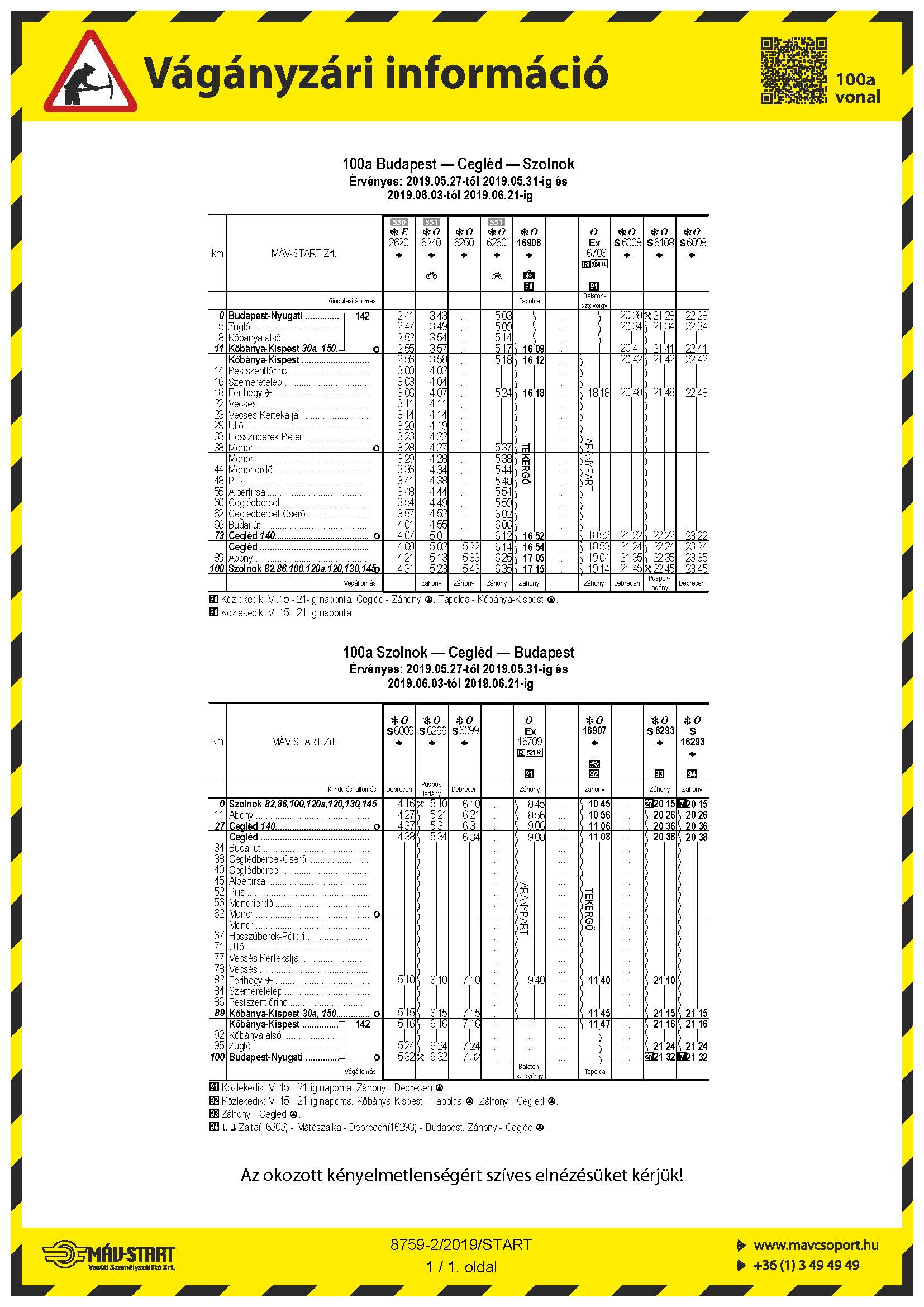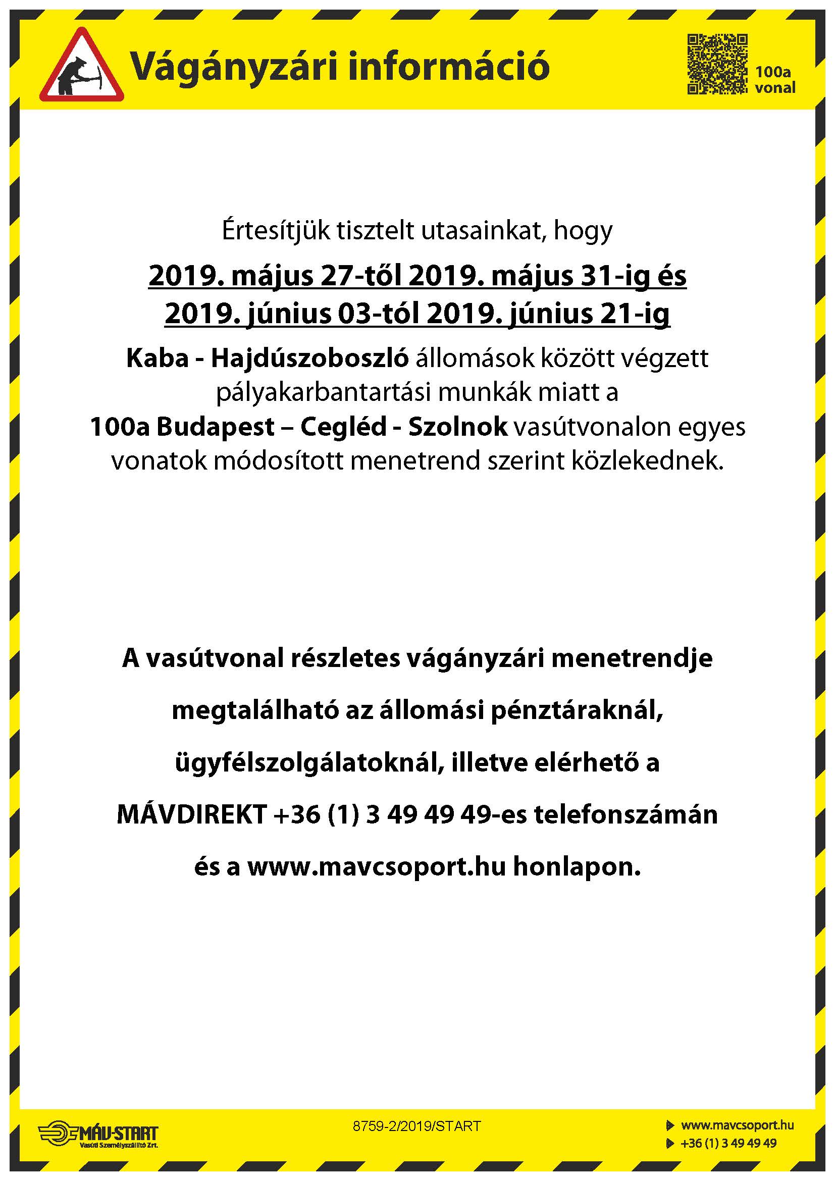 A MÁV-START Zrt. tájékoztatása szerint 2019. május 27-től 2019. május 31-ig és 2019. június 3-tól 2019. június 21-ig Kaba és Hajdúszoboszló állomások között végzett pályakarbantartási munkák miatt az alábbi vonatok módosított menetrend szerint közlekednek.