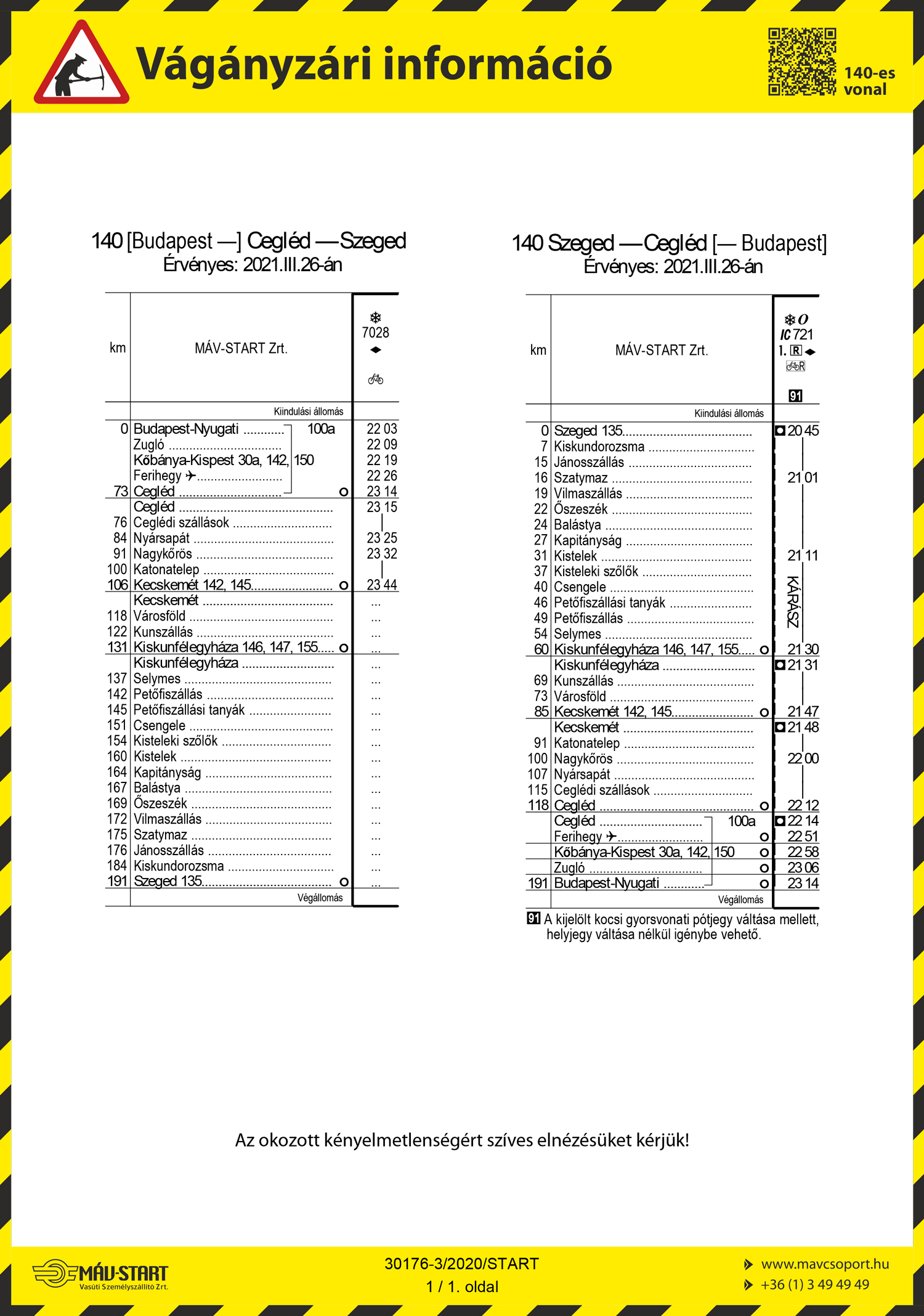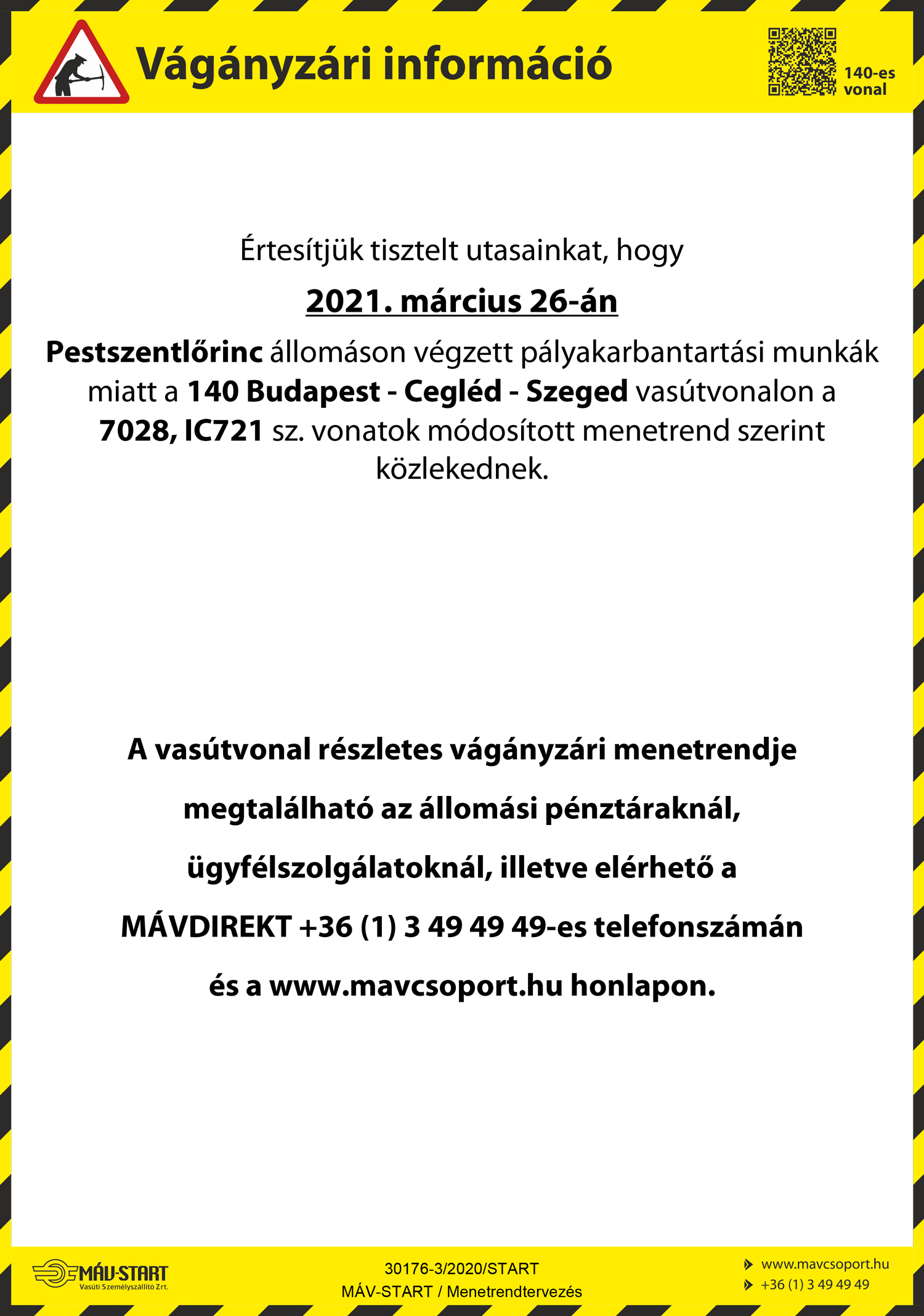 Értesítjük tisztelt utasainkat, hogy 2021. március 26-án Pestszentlőrinc állomáson végzett pályakarbantartási munkák miatt a 140 Budapest - Cegléd - Szeged vasútvonalon a 7028, IC721 sz. vonatok módosított menetrend szerint közlekednek.