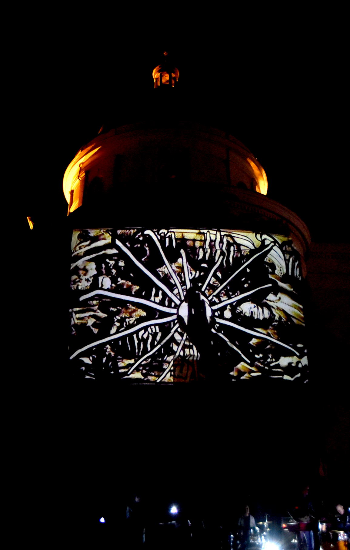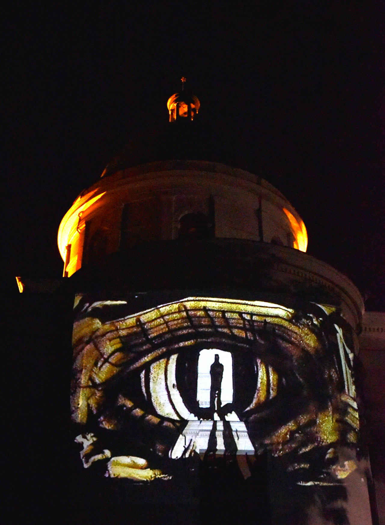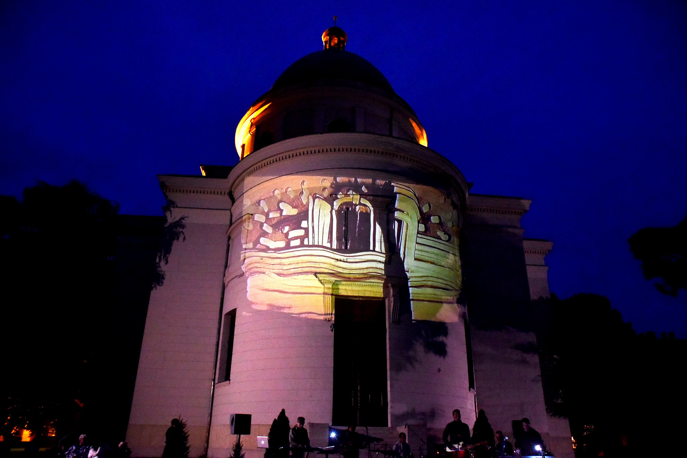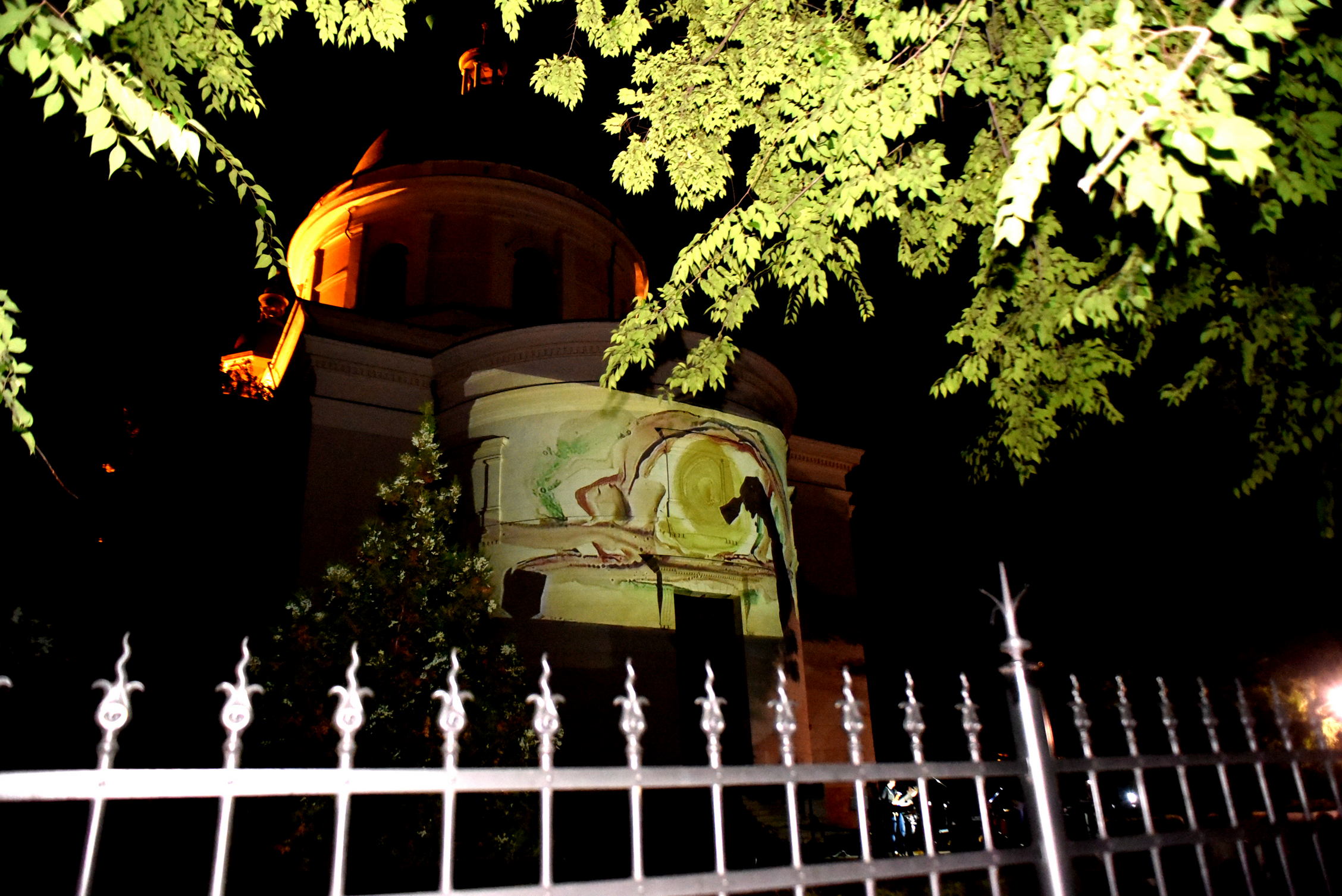 A kettős csoda aztán akkor kezdődött, amikor beesteledett, s a templom kupolája és néhány fény adott sejtelmes világítást. A felcsendülő zenével egy időben megkezdődött egy olyan képi megjelenítés, amitől mindenki szeme-szája elállt. A zene ritmusára, hangulatára hangolva, simulva képek, történések vetítődtek fel a templom falára, s olyan jelenetek rajzolódtak ki egyik pillanatról a másikra, hogy nem tudta az ember hirtelen a zenét és a képeket összehangolni, értelmezni. A képzelőerejét kellett bevetni, hogy mindezt összerendezze. A technikai része a vetítésnek egy alulról megvilágított 1x2 méteres üveglapon történt, egy szolnoki művész keze nyoma által, aki a homokot szórta, s egyedi látásmóddal alkotta a történeteket.