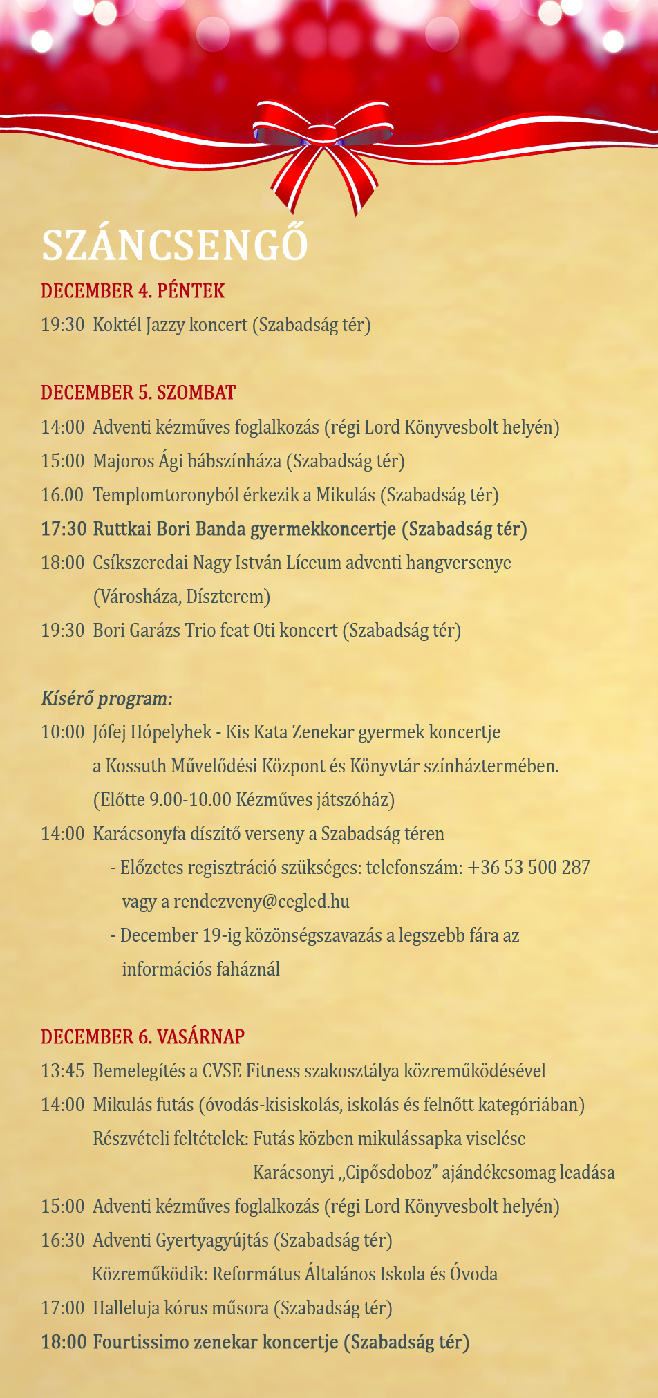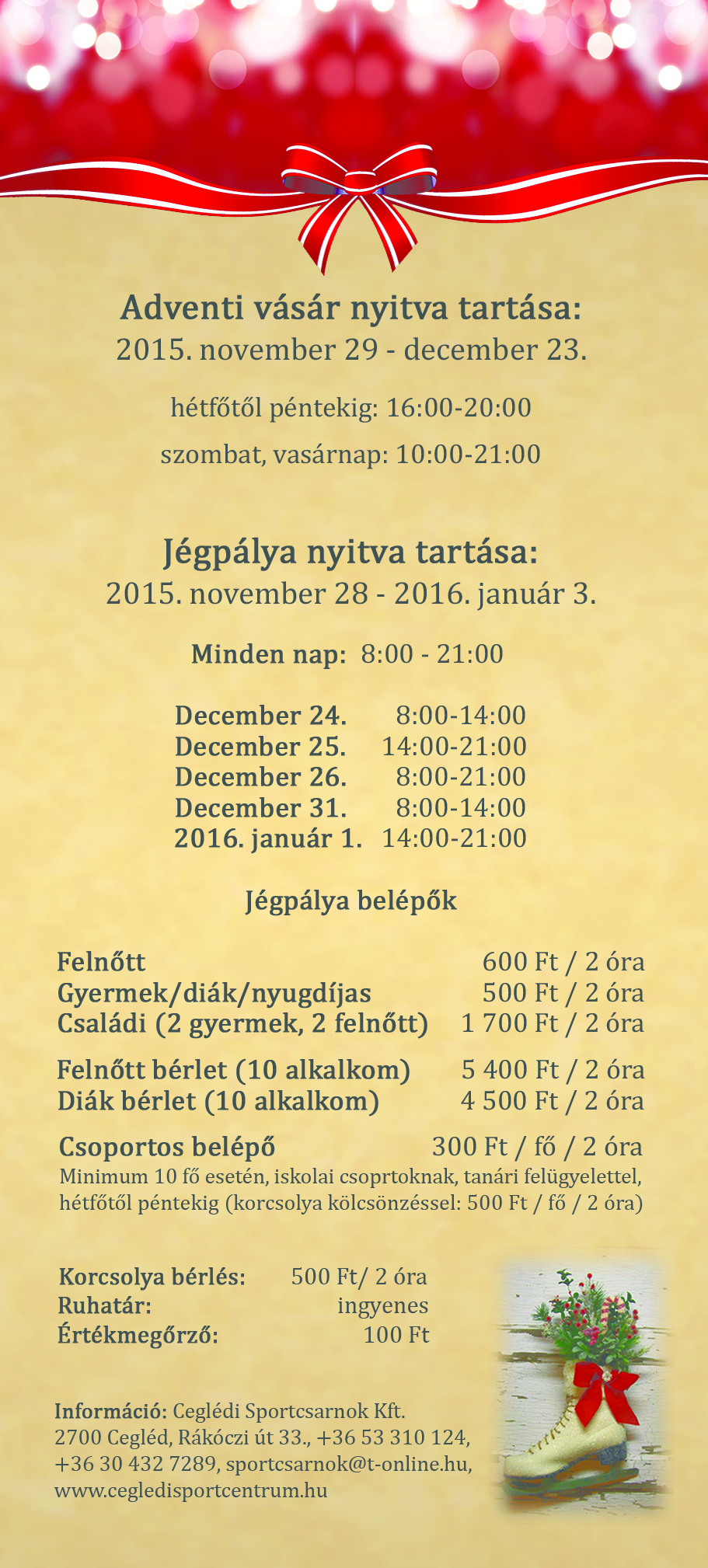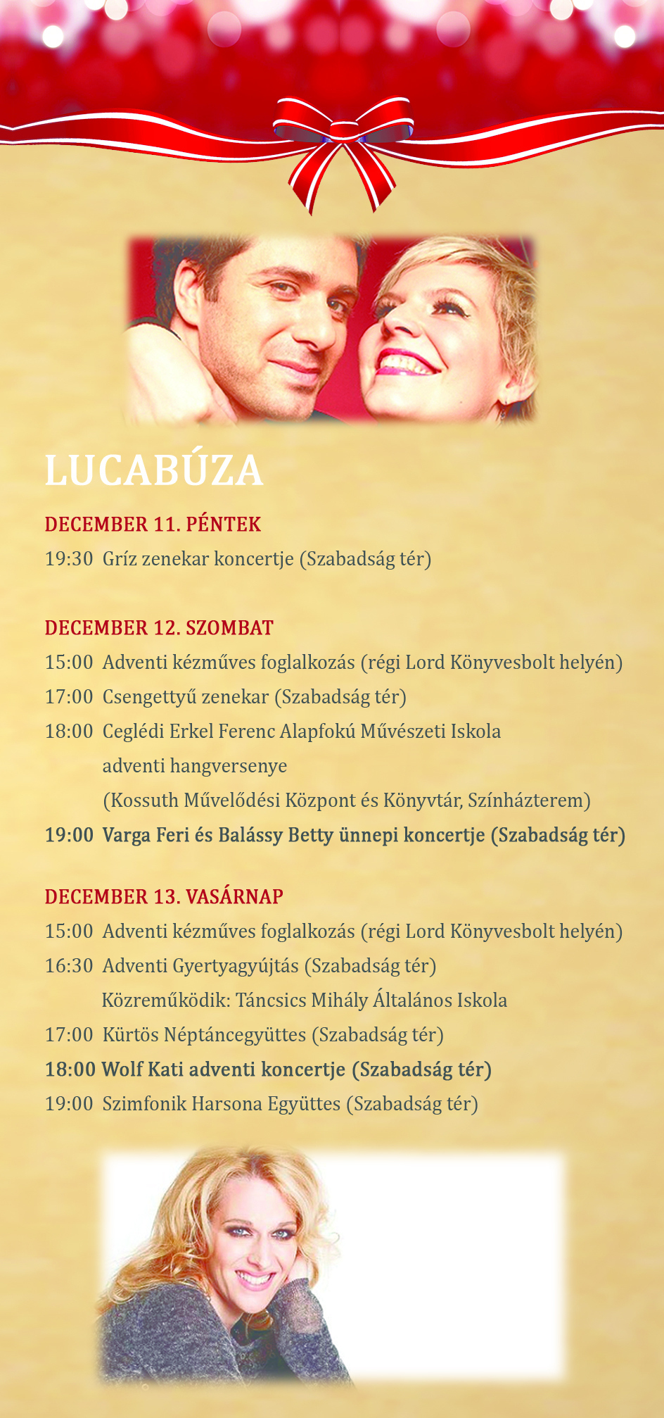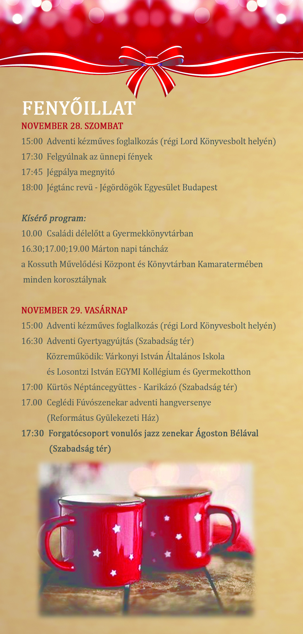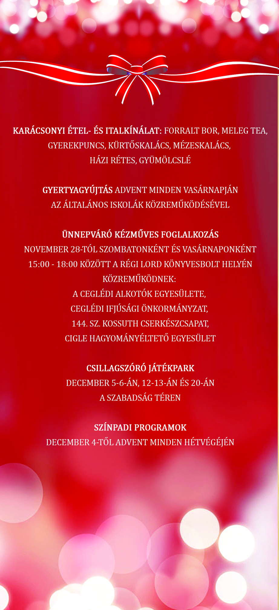 Cegléd Város Önkormányzata ez évben is megszervezi Adventi Kirakodó Vásárt a Szabadság téren. A tavalyi évhez hasonlóan az adventi hétvégéken színvonalas, családi és gyermek programokkal várják a kilátogatókat.